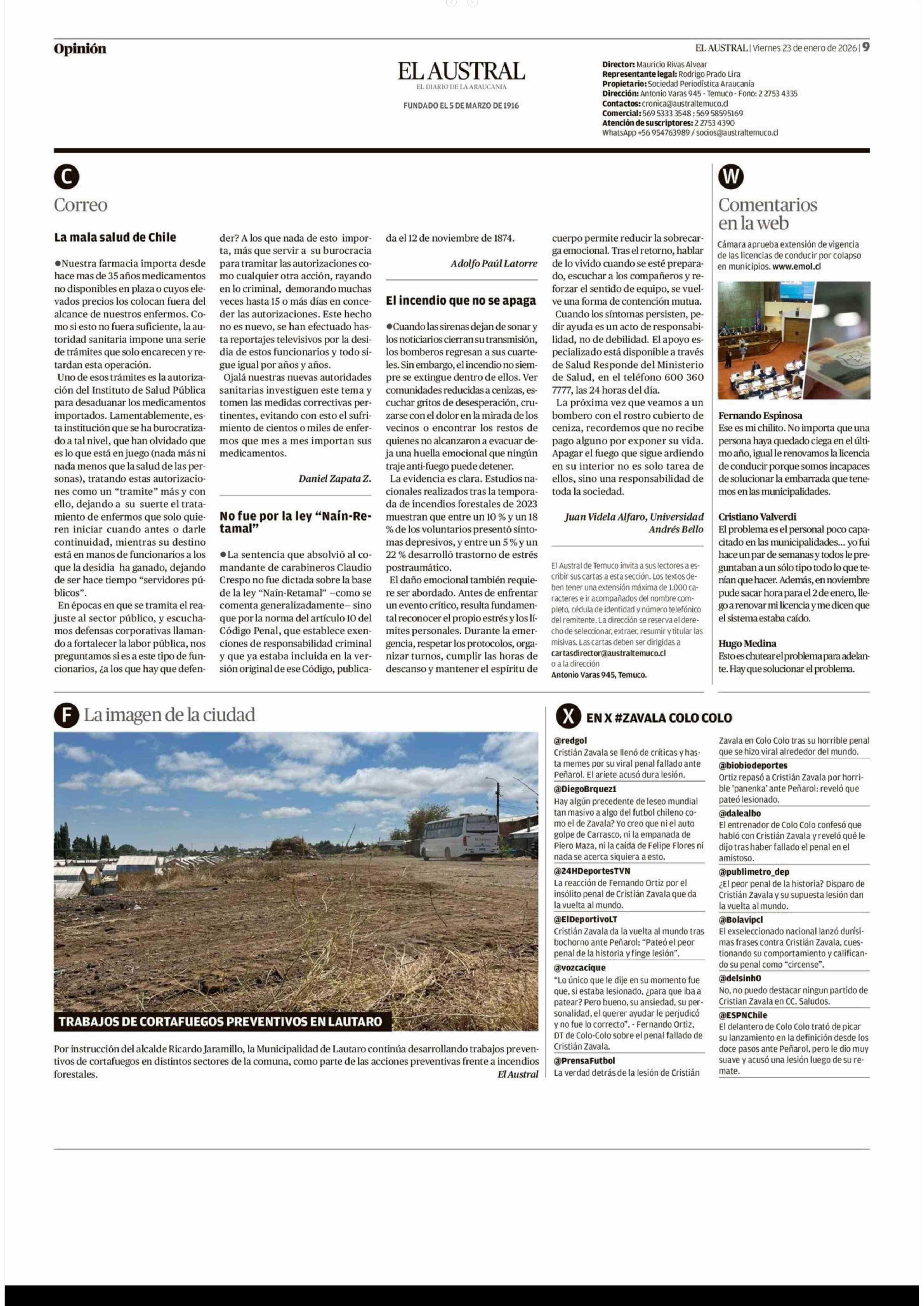 Cartas: El incendio que no se apaga 23-01-2026 El Austral de la Araucanía |
