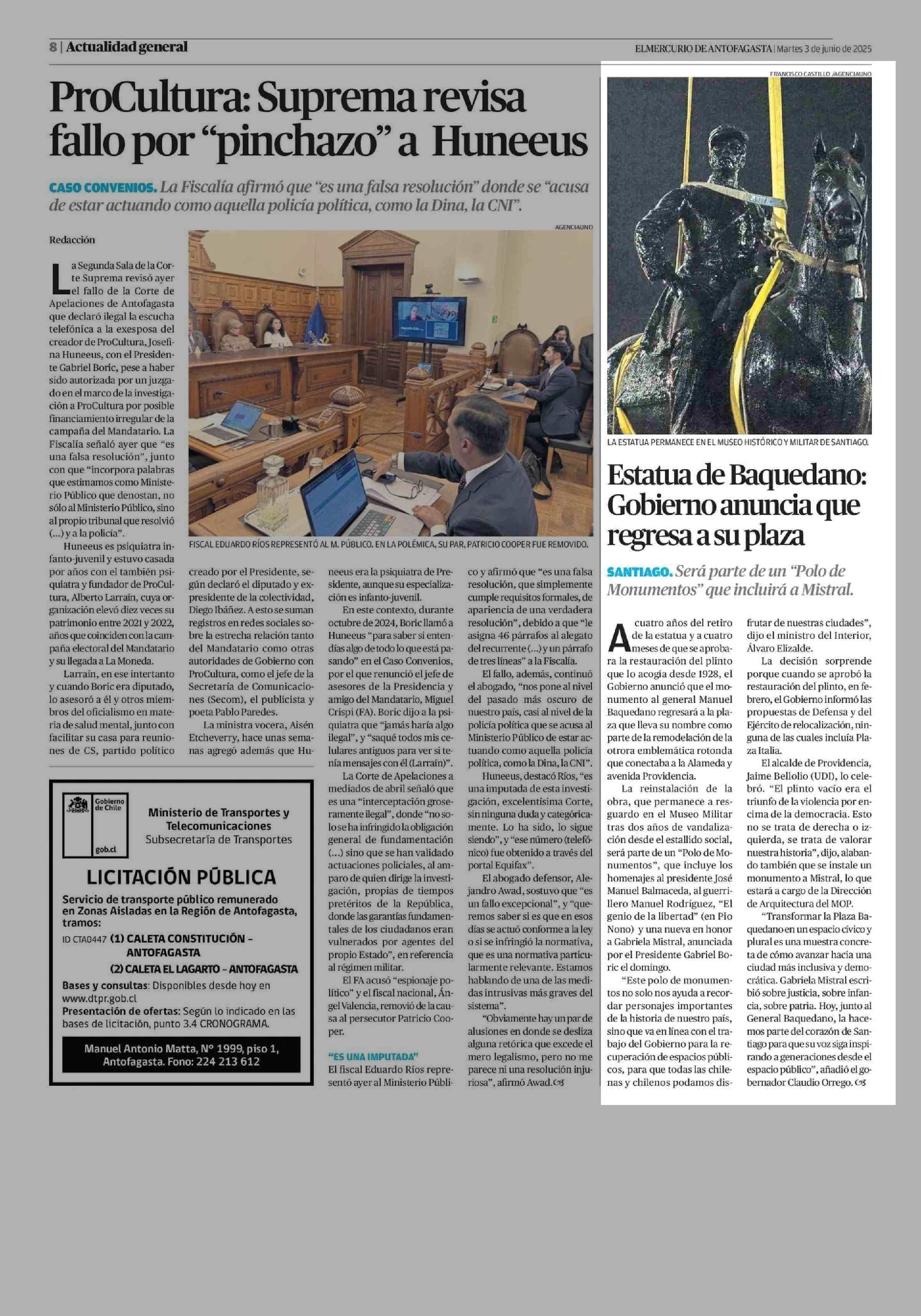 Estatua de Baquedano: Gobierno anuncia que regresa a su plaza 03-06-2025 El Mercurio de Antofagasta |