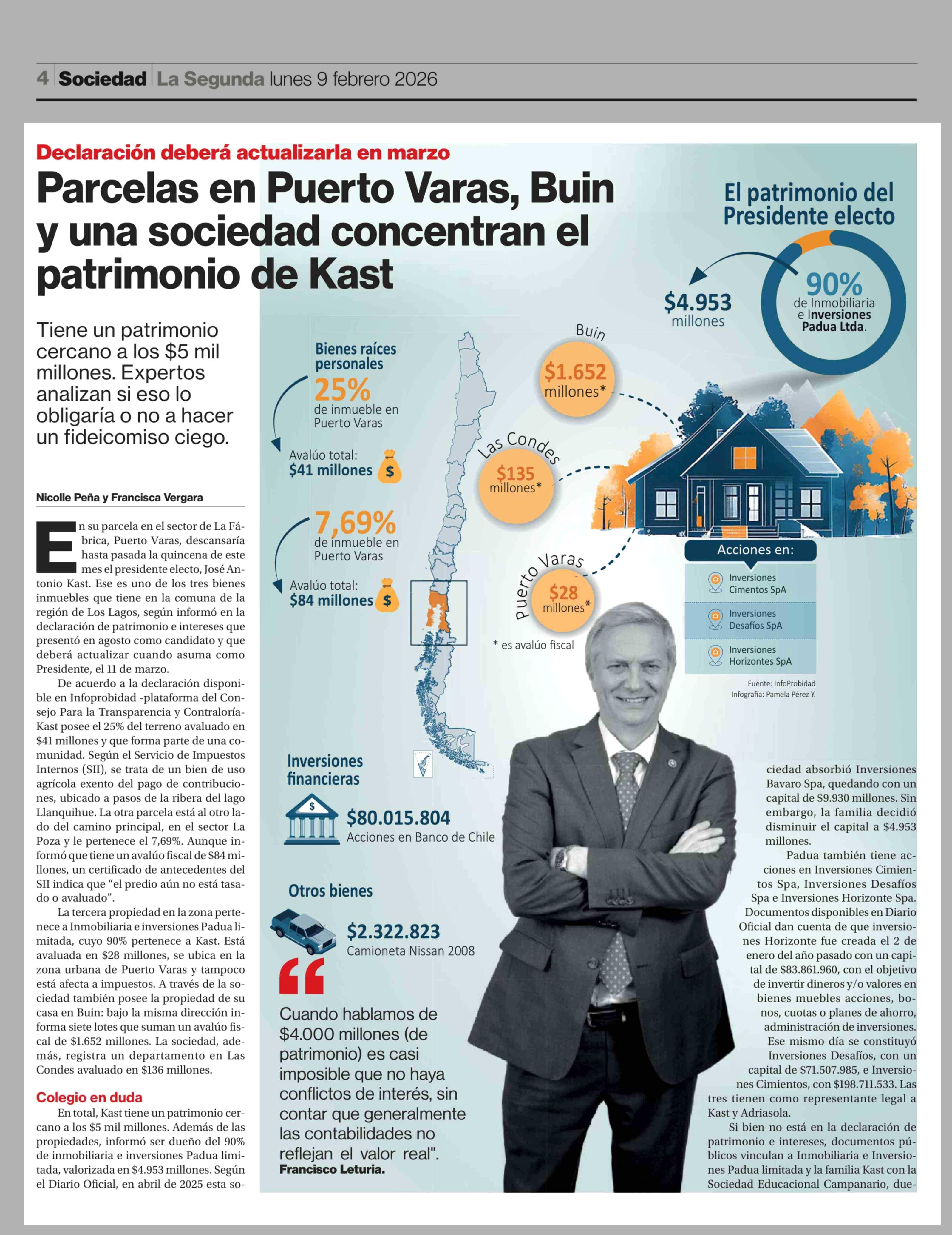 Parcelas en Puerto Varas, Buin y una sociedad concentran el patrimonio de Kast 09-02-2026 La Segunda |
