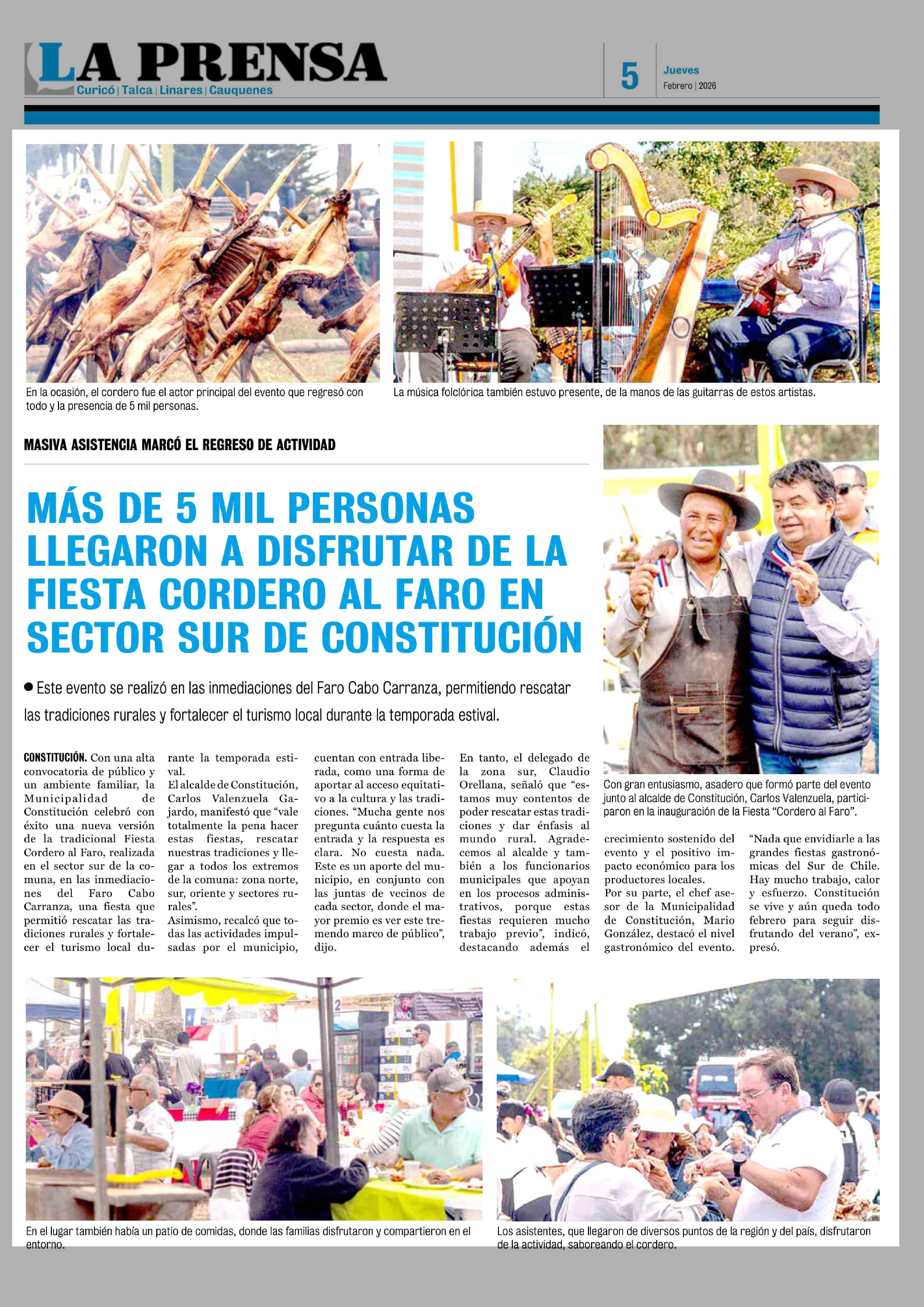 MÁS DE 5 MIL PERSONAS LLEGARON A DISFRUTAR DE LA FIESTA CORDERO AL FARO EN SECTOR SUR DE CONSTITUCIÓN 05-02-2026 La Prensa de Curicó |