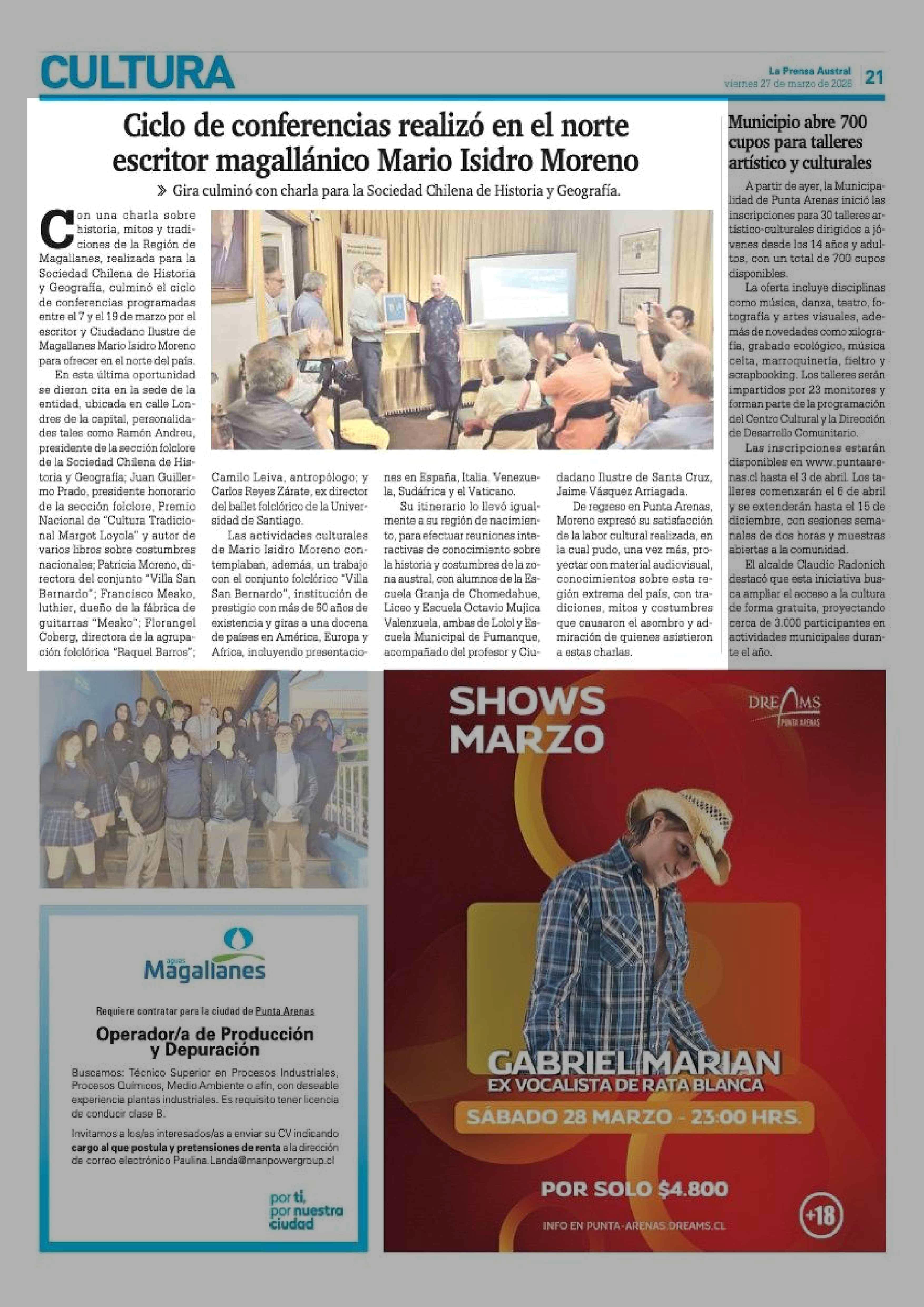 Ciclo de conferencias realizó en el norte escritor magallánico Mario Isidro Moreno 27-03-2026 La Prensa Austral |