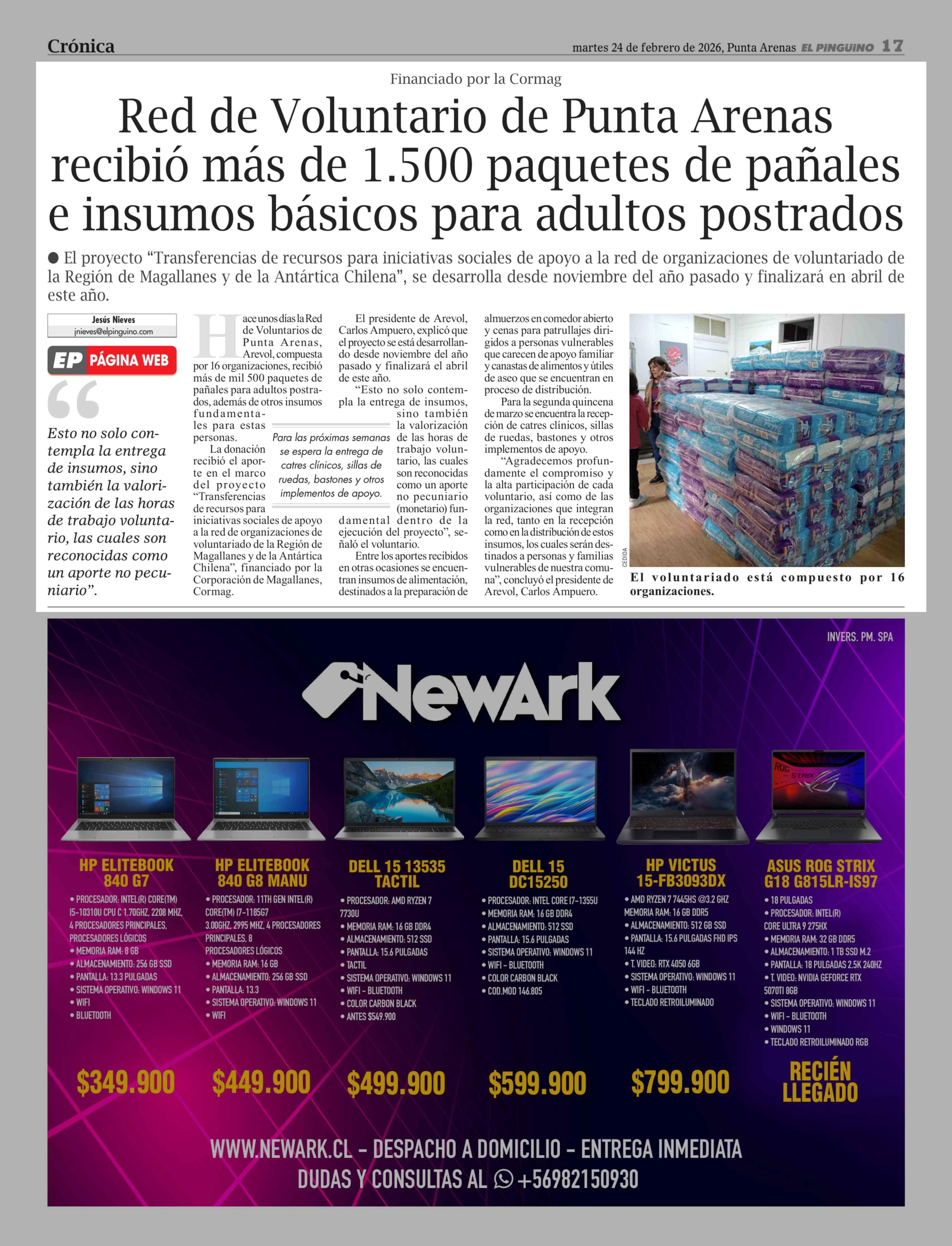 Red de Voluntario de Punta Arenas recibió más de 1.500 paquetes de pañales e insumos básicos para adultos postrados 24-02-2026 El Pingüino |