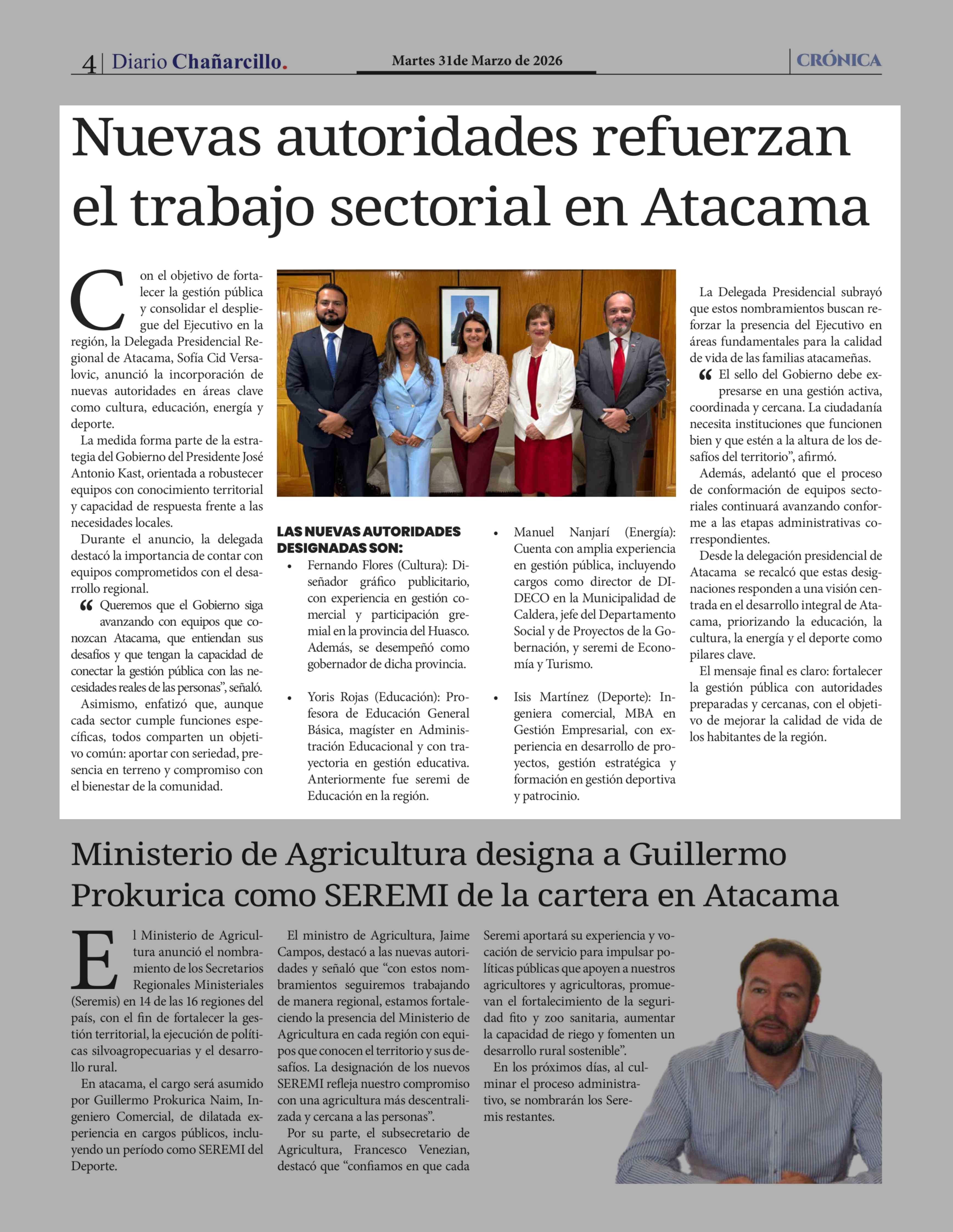 Nuevas autoridades refuerzan el trabajo sectorial en Atacama 31-03-2026 Diario Chañarcillo |