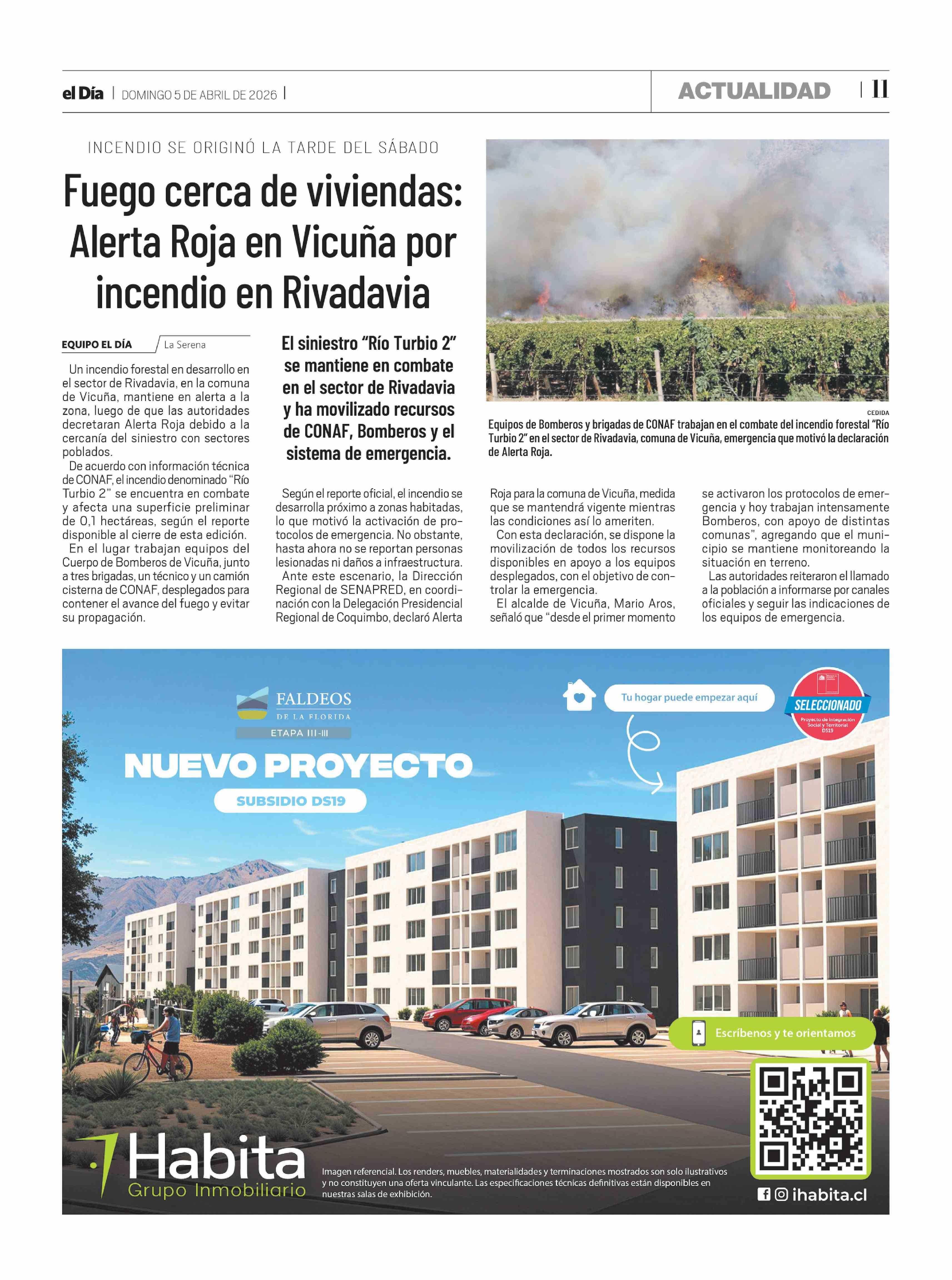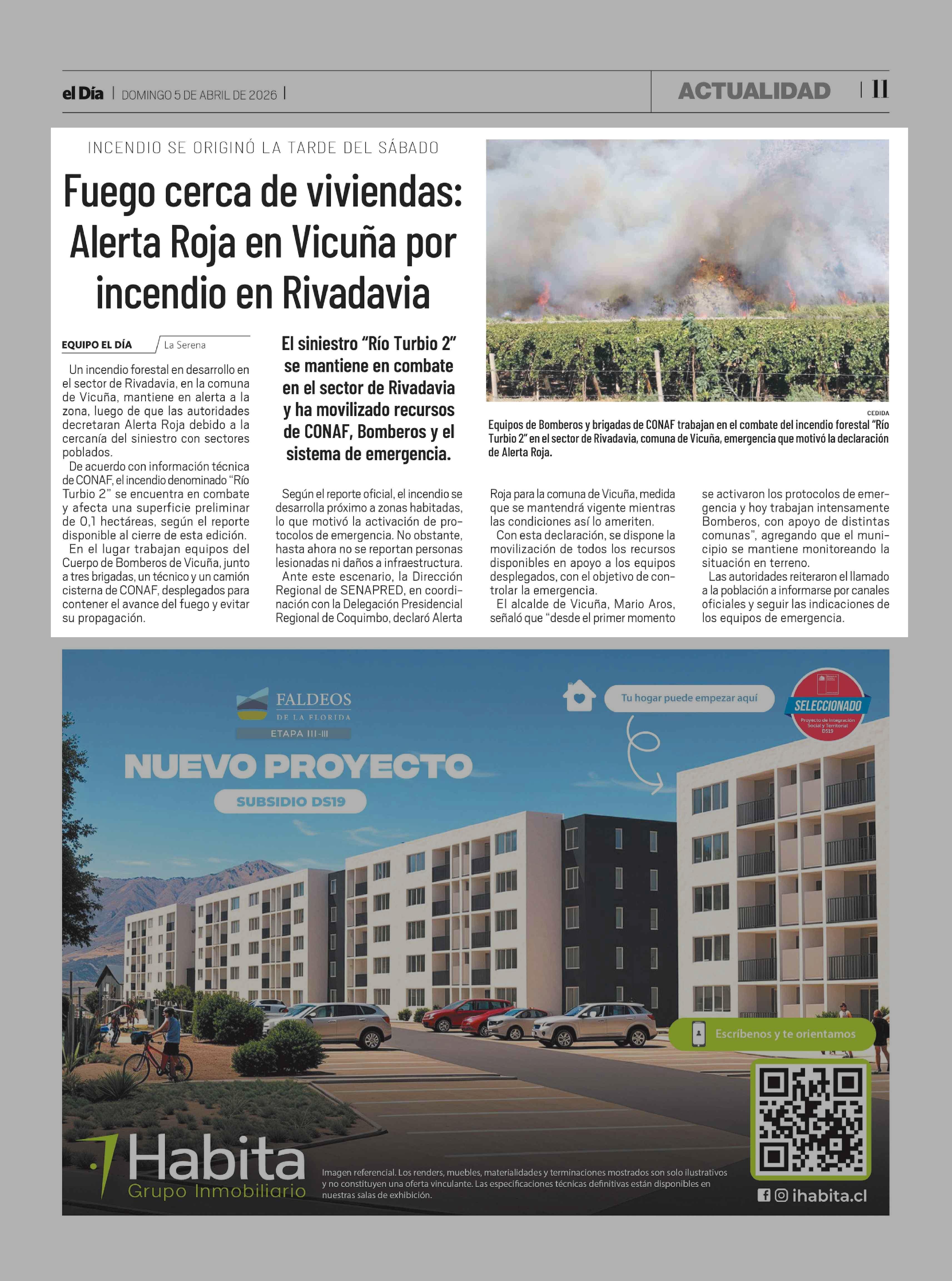 Título: Fuego cerca de viviendas: Alerta Roja en Vicuña por incendio en Rivadavia