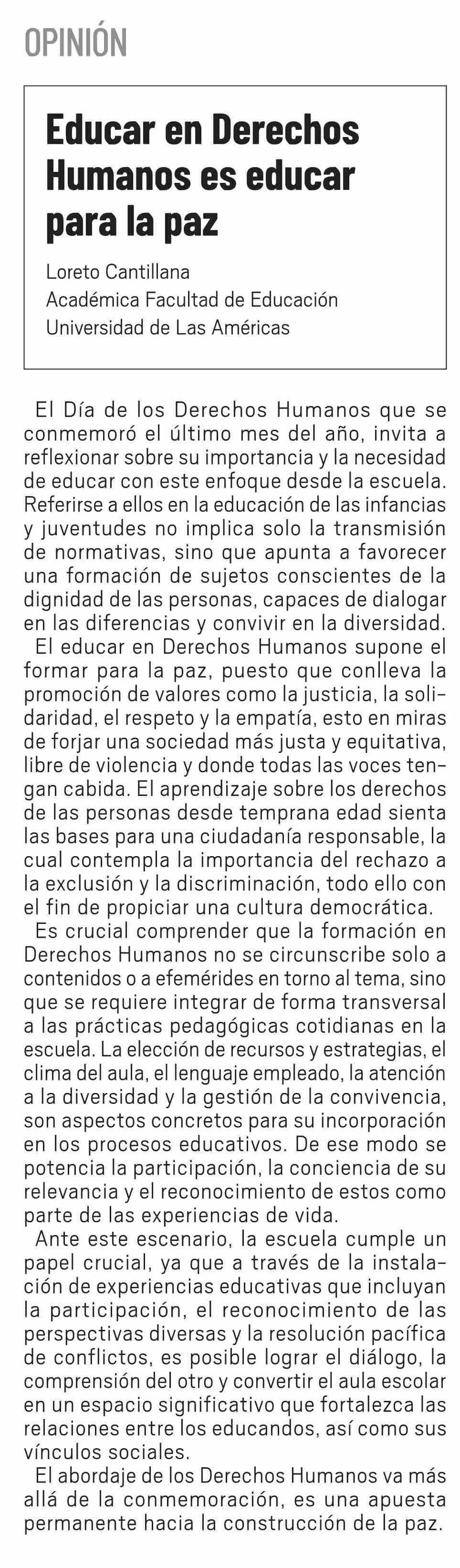 Columnas de Opinión: Educar en Derechos Humanos es educar para la paz 12-01-2026 El Día |