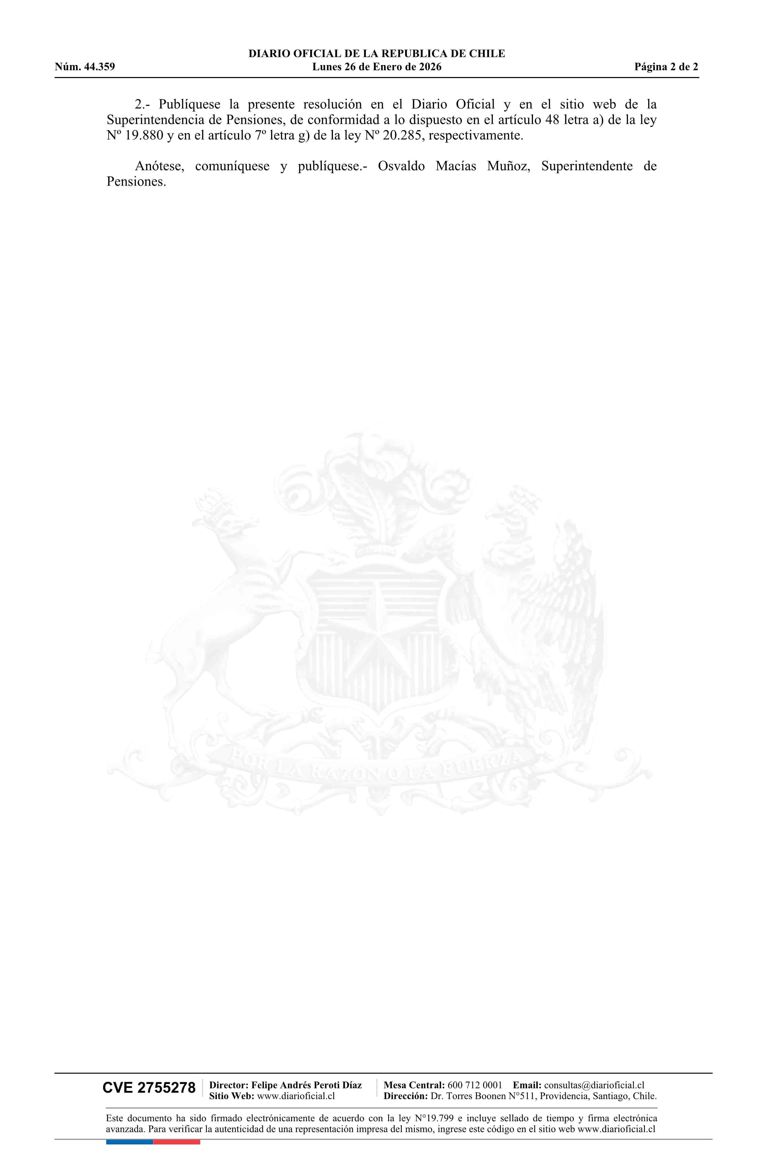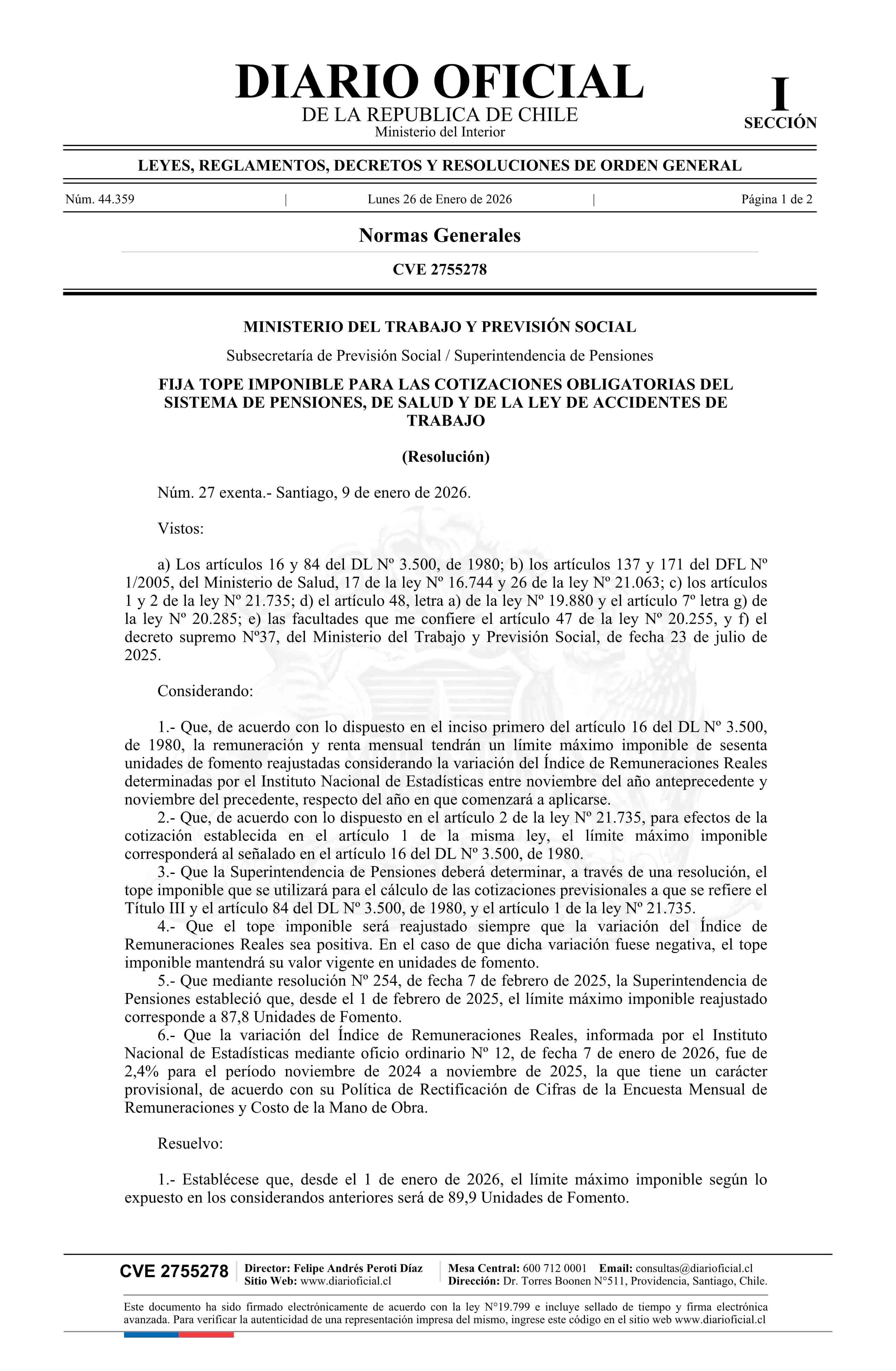 Título: Resolución exenta número 27, de 2026.- Fija tope imponible para las cotizaciones obligatorias del sistema de pensiones, de salud y de la ley de accidentes de trabajo