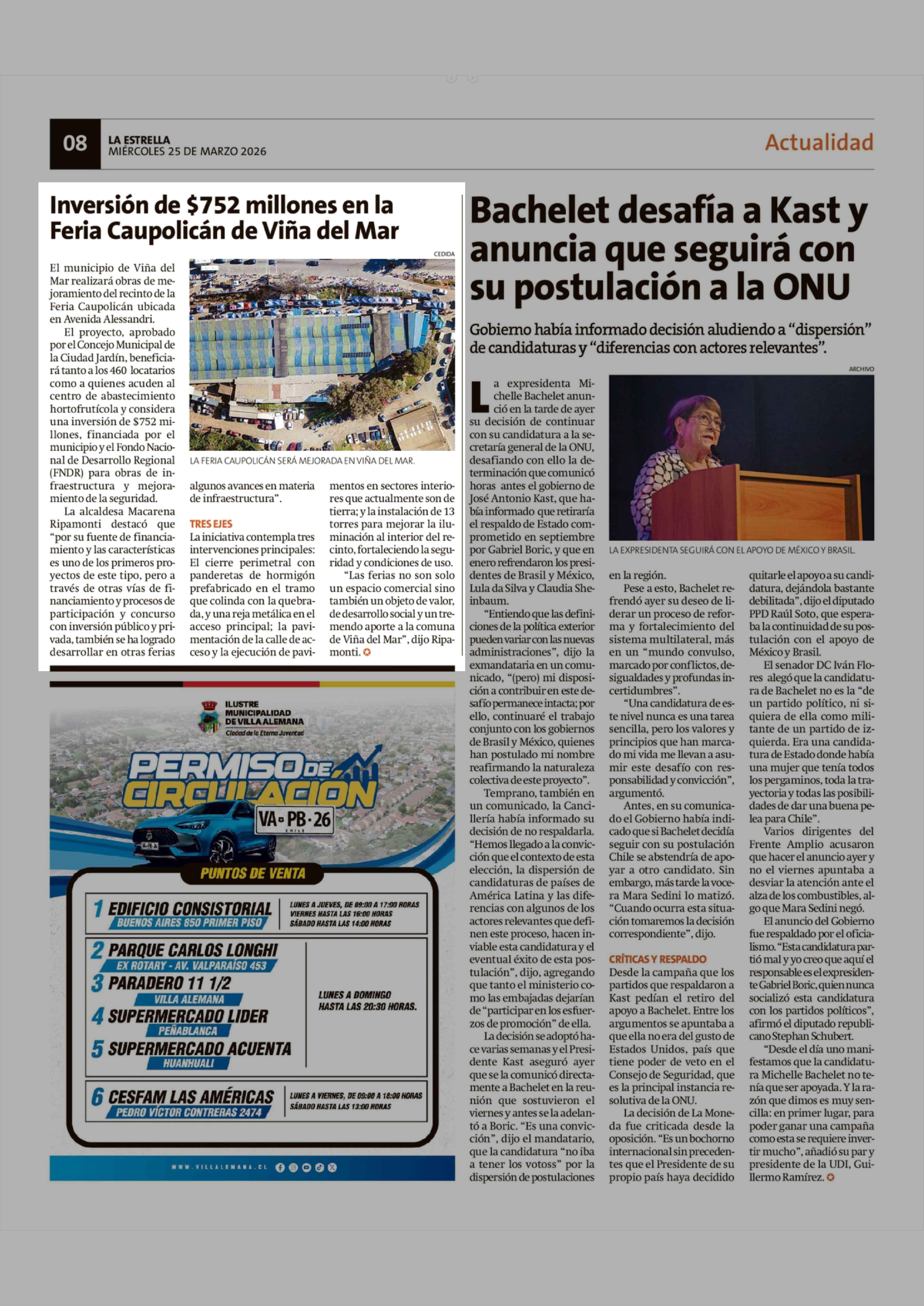 Inversión de $752 millones en la Feria Caupolicán de Viña del Mar 25-03-2026 La Estrella de Valparaíso |