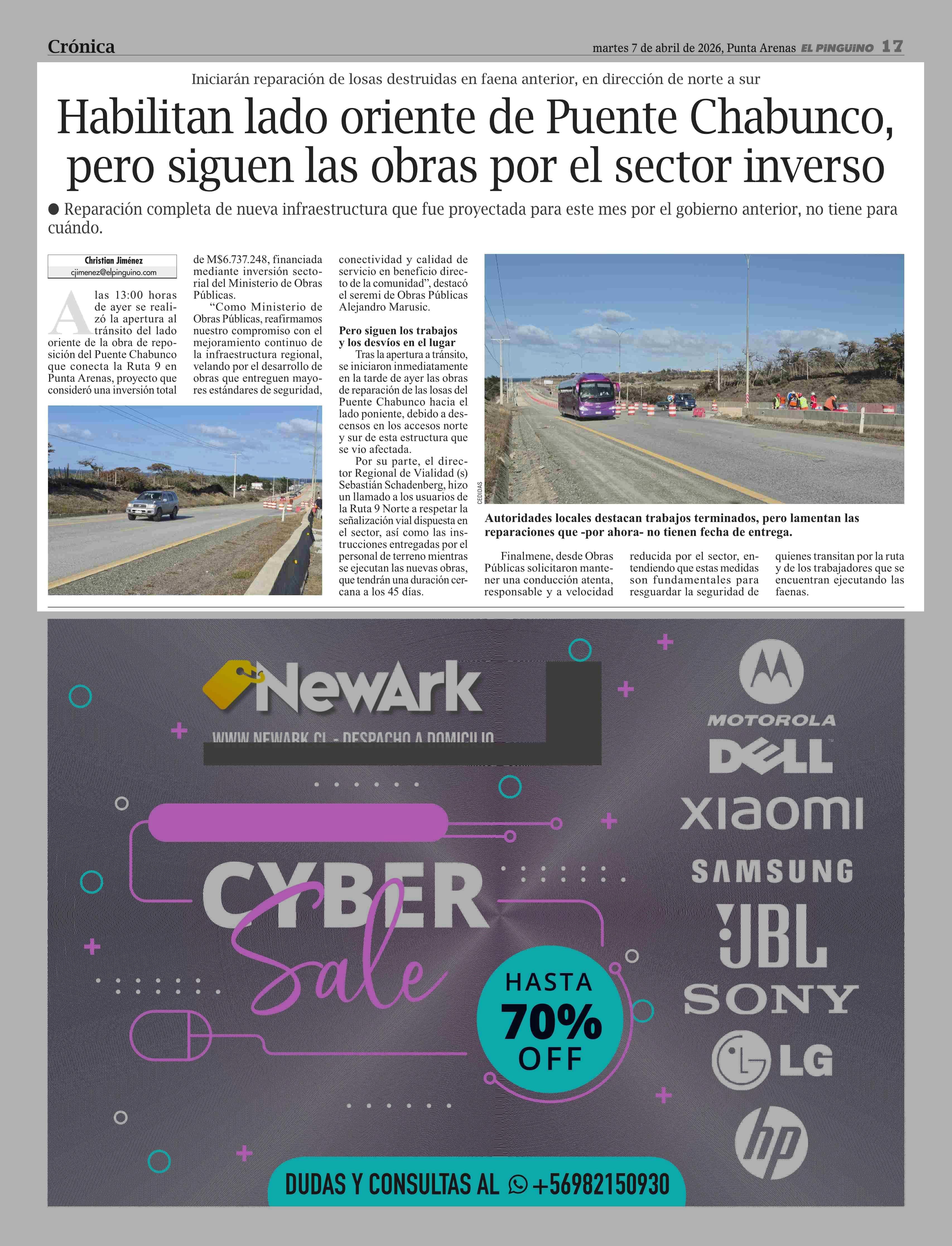 Habilitan lado oriente de Puente Chabunco, pero siguen las obras por el sector inverso 07-04-2026 El Pingüino |