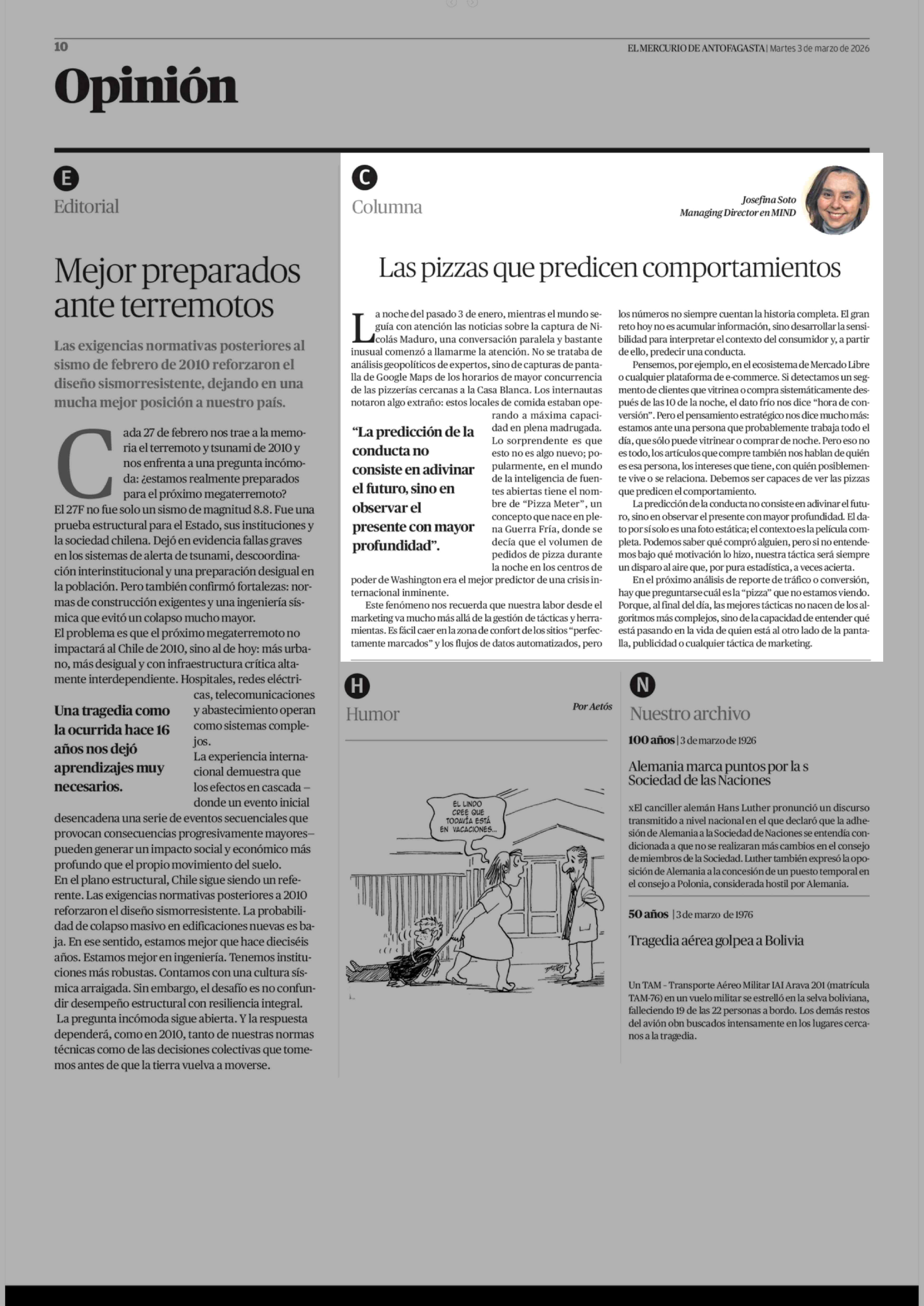 Columnas de Opinión: Las pizzas que predicen comportamientos 03-03-2026 El Mercurio de Antofagasta |