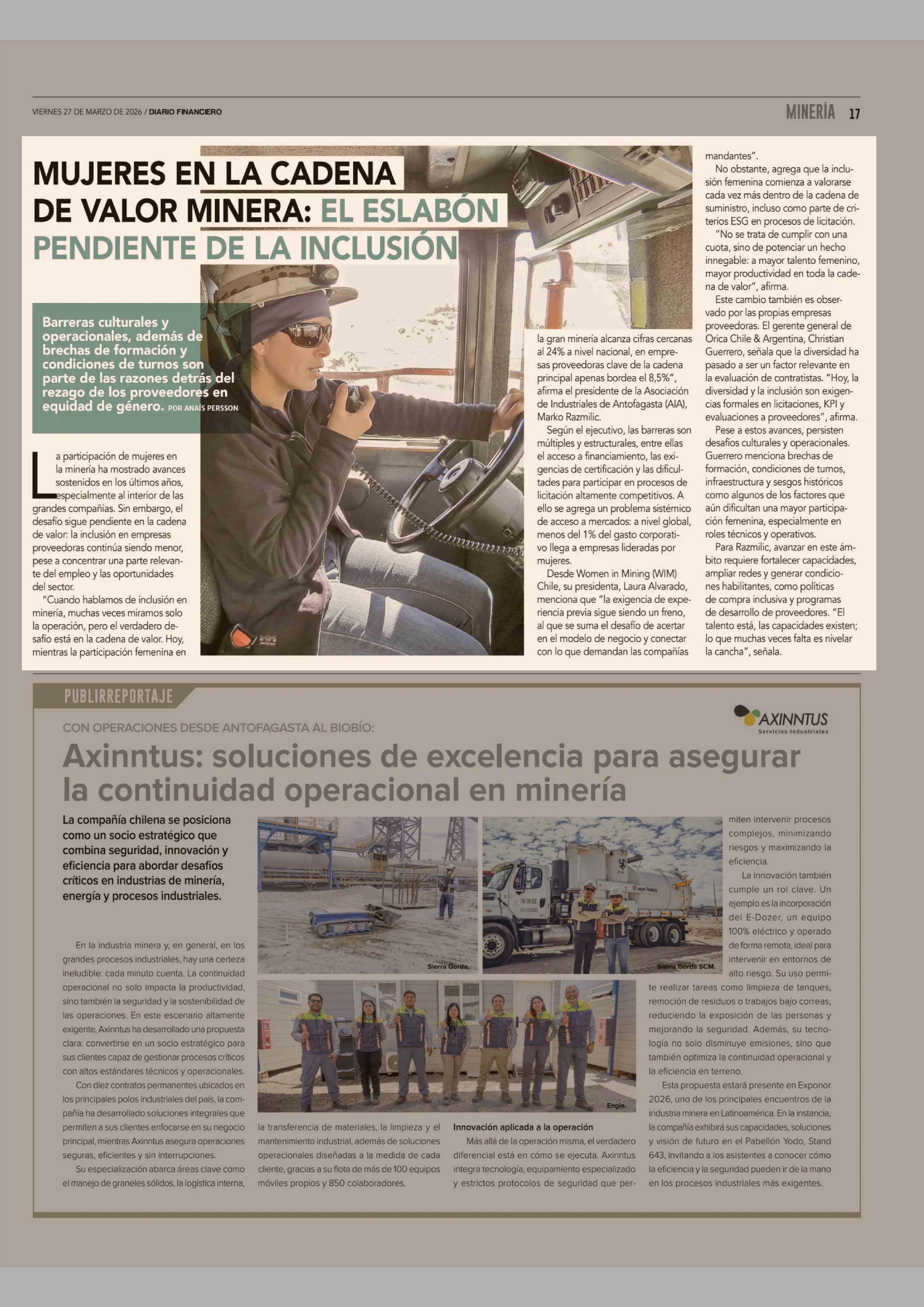 MUJERES EN LA CADENA DE VALOR MINERA: EL ESLABÓN PENDIENTE DE LA INCLUSIÓN 27-03-2026 Diario Financiero |