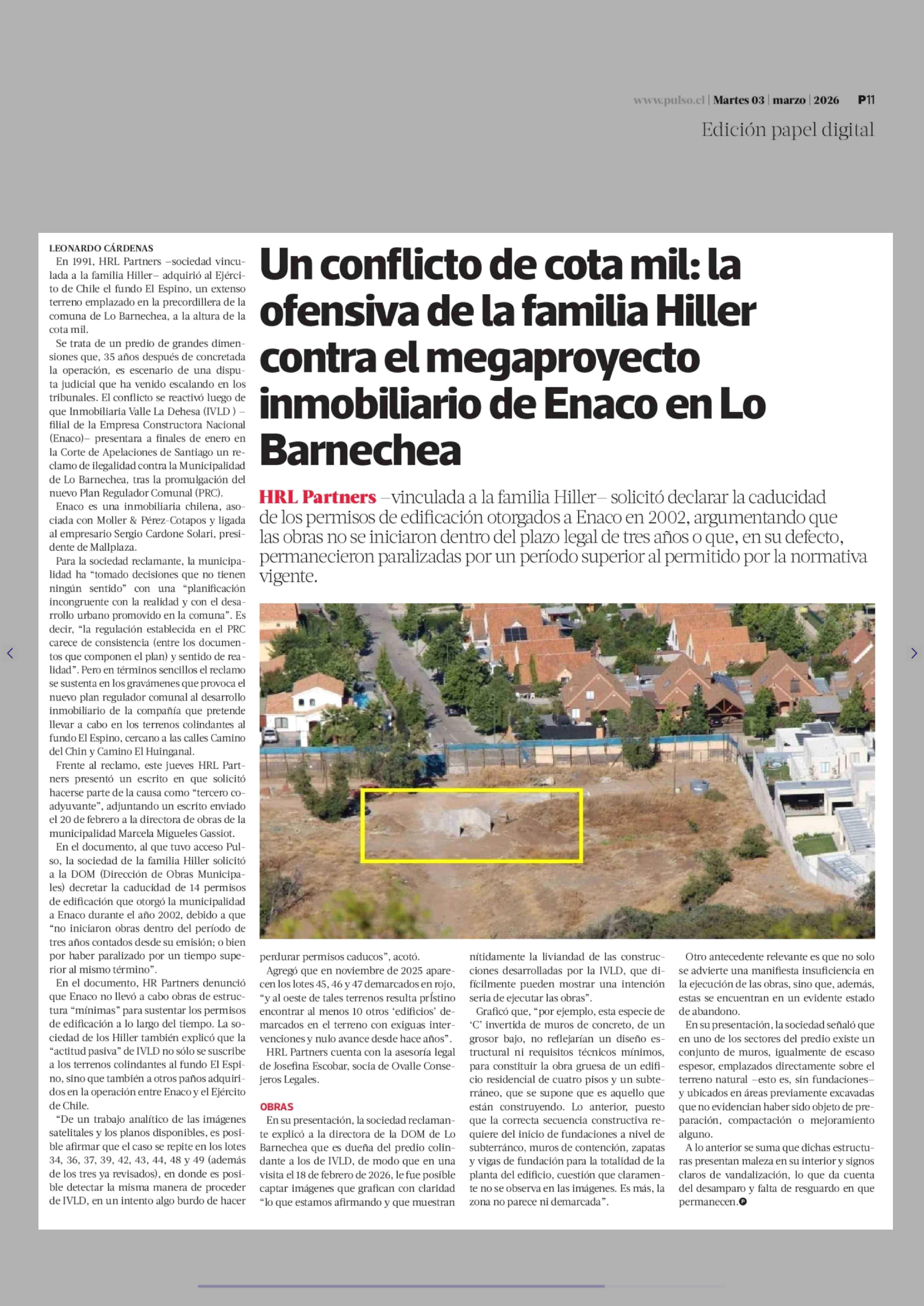 Título: Un conflicto de cota mil: la ofensiva de la familia Hiller contra el megaproyecto inmobiliario de Enaco en Lo Barnechea