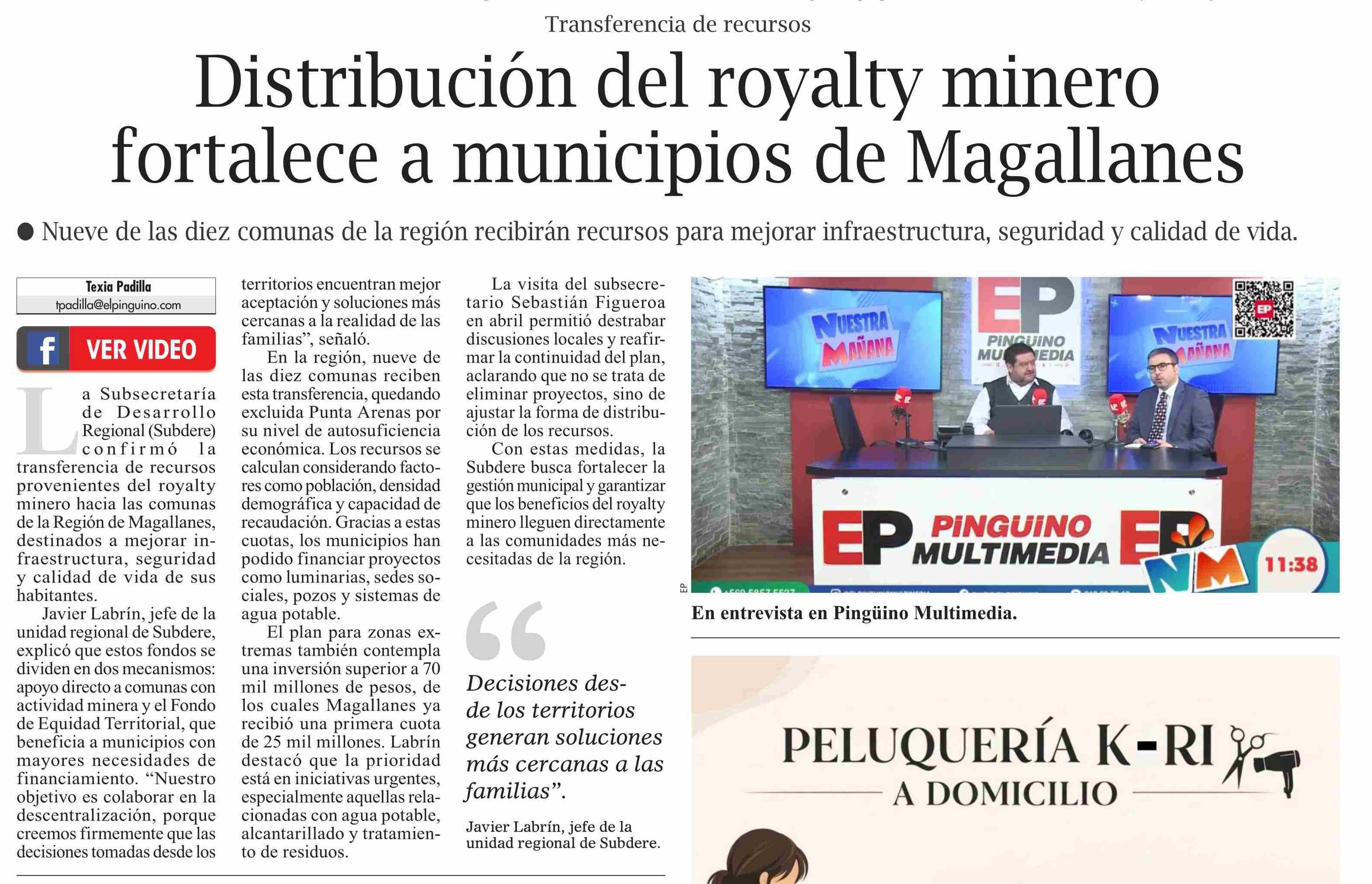 Título: Distribución del royalty minero fortalece a municipios de Magallanes