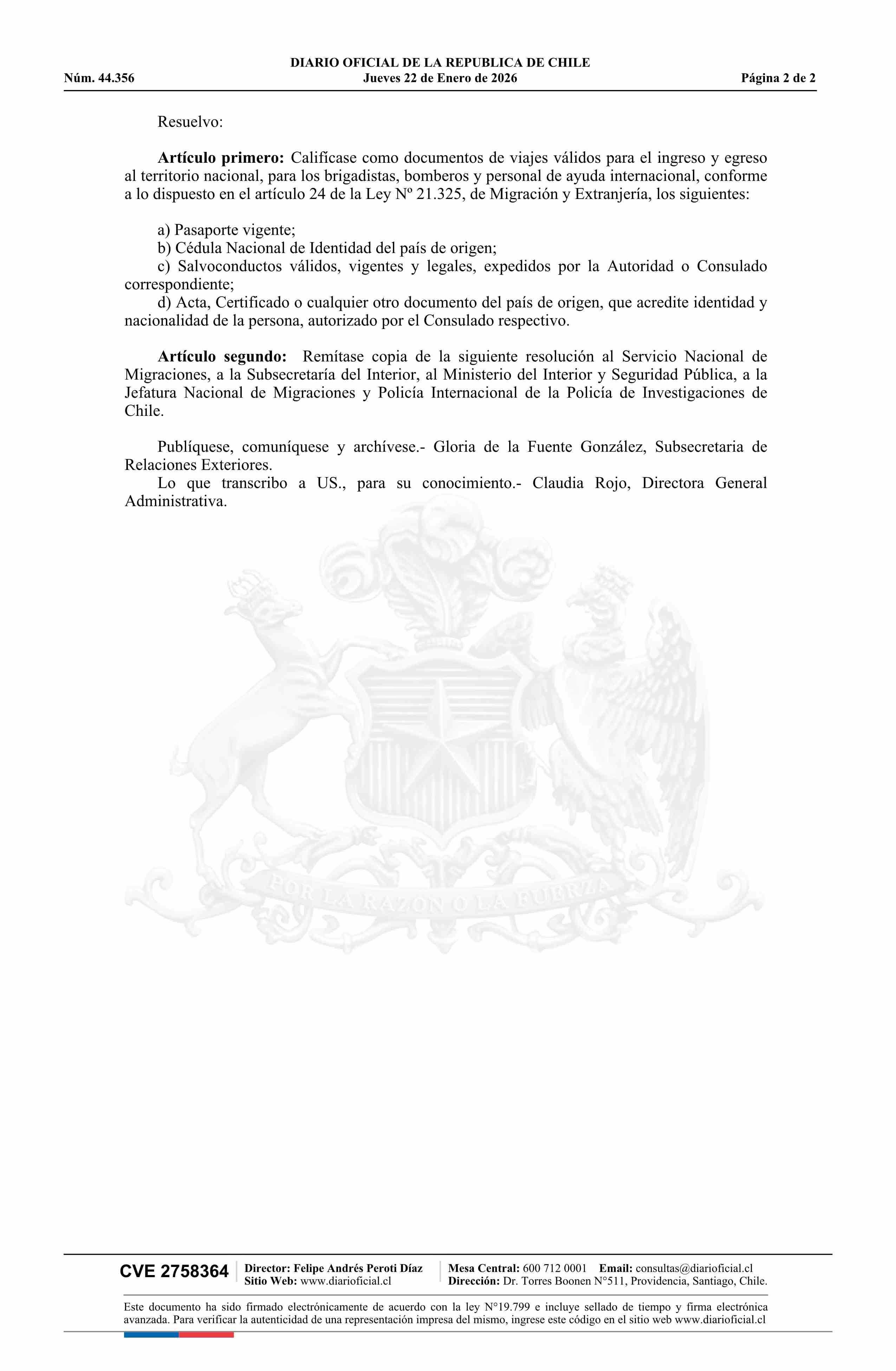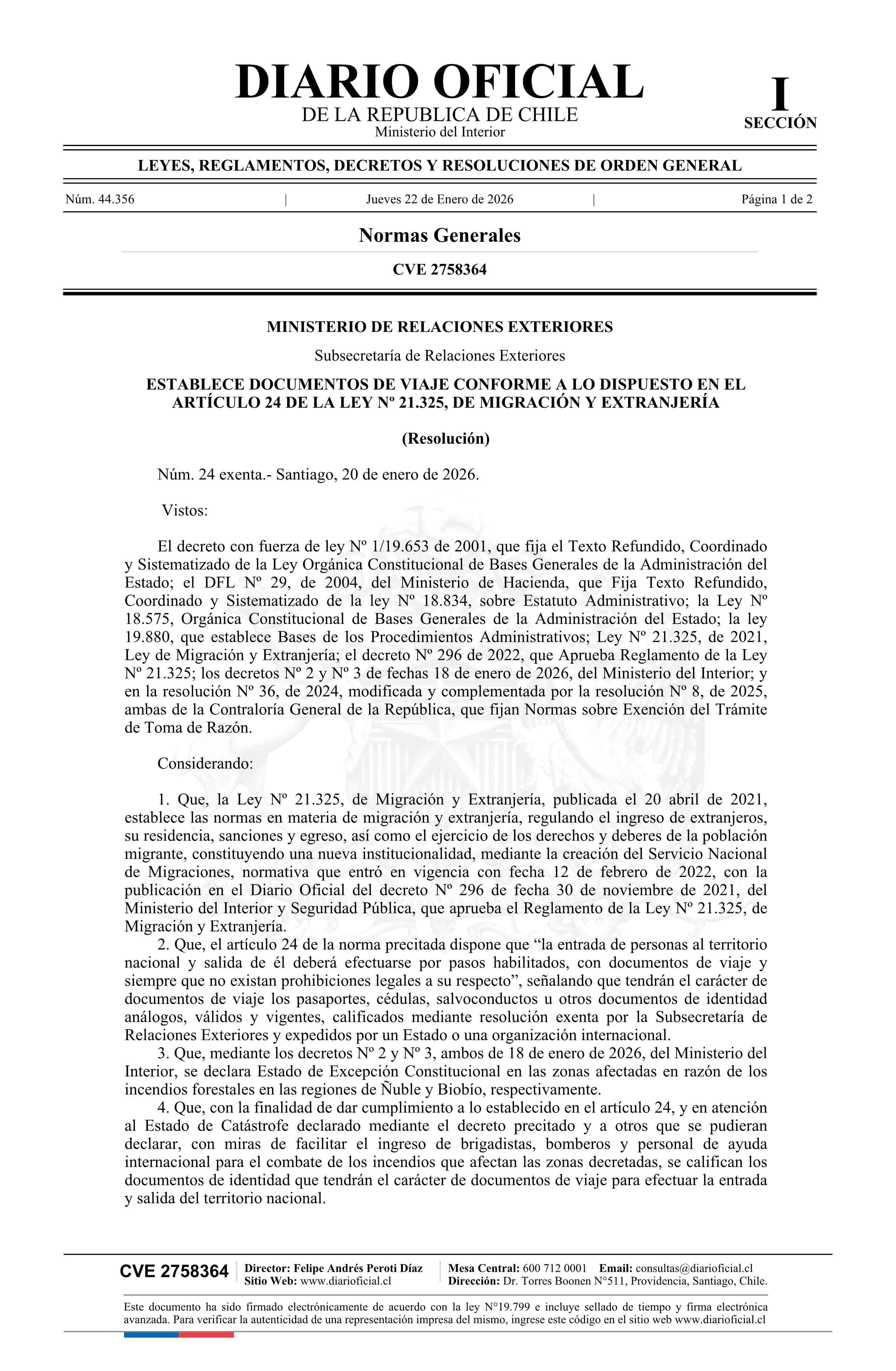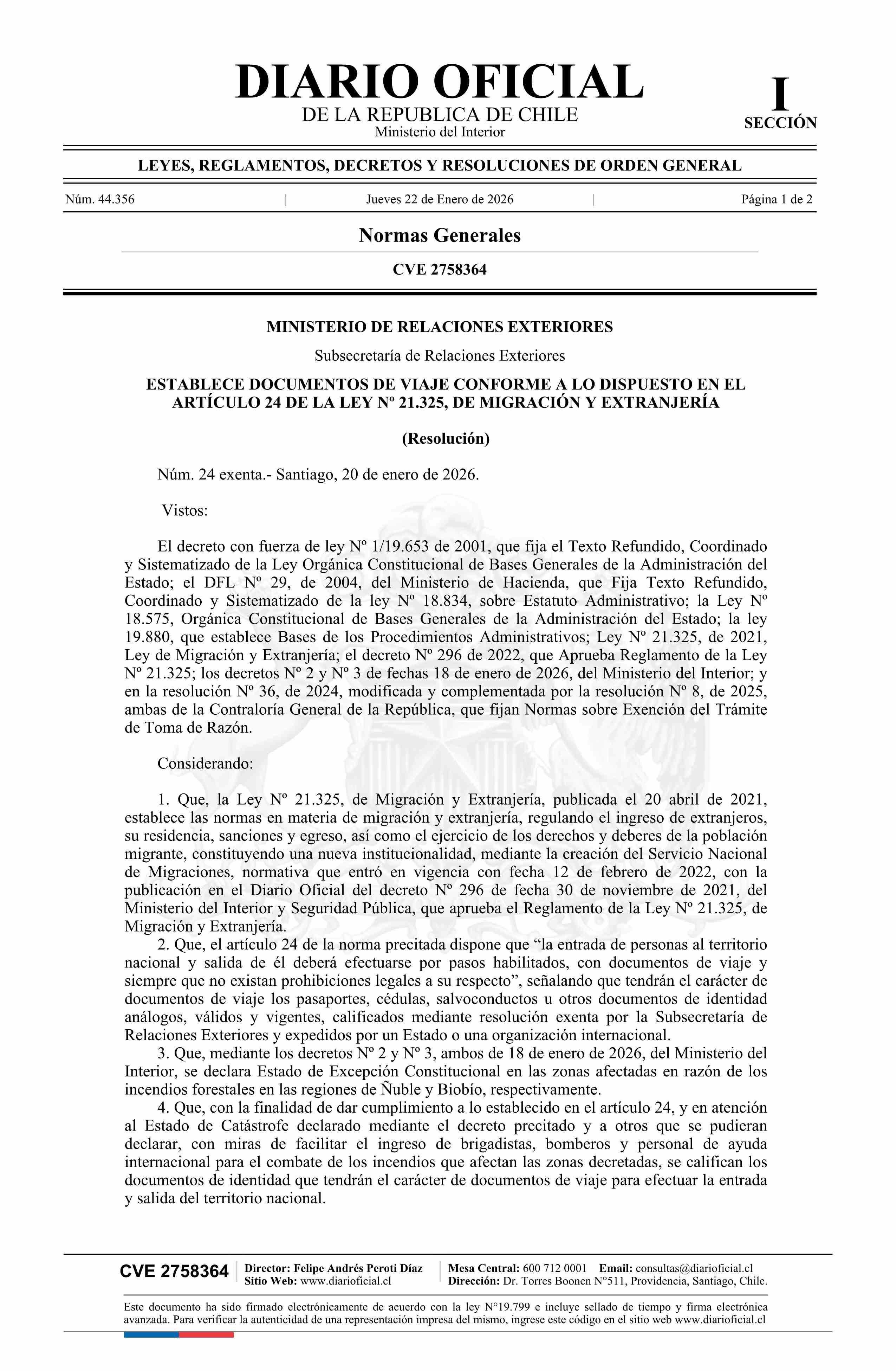 | Título: | Resolución exenta número 24, de 2026.- Establece documentos de viaje conforme a lo dispuesto en el artículo 24 de la Ley Nº 21.325, de Migración y Extranjería |