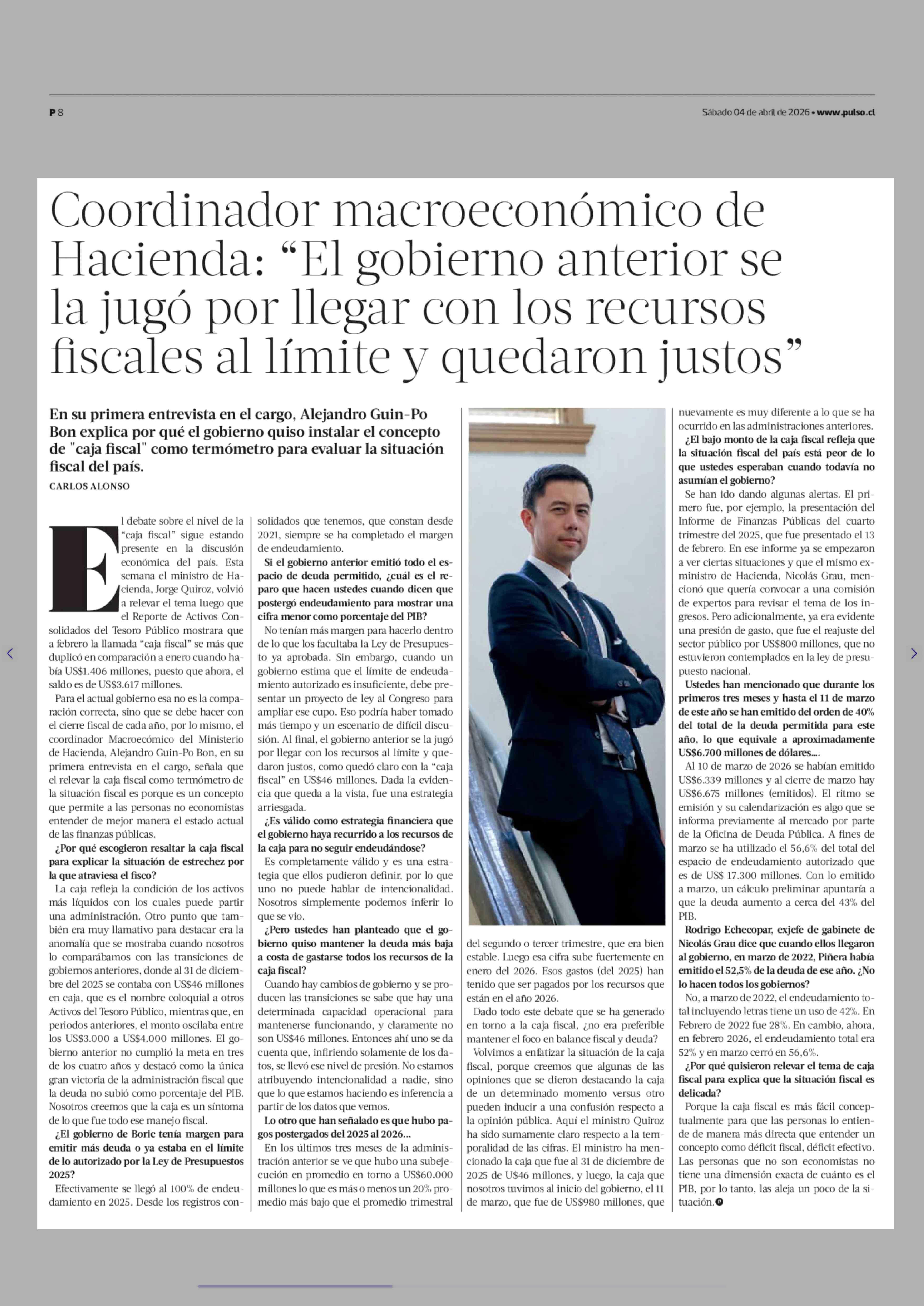 Coordinador macroeconómico de Hacienda: "El gobierno anterior se la jugó por llegar con los recursos fiscales al límite y quedaron justos" 04-04-2026 La Tercera |