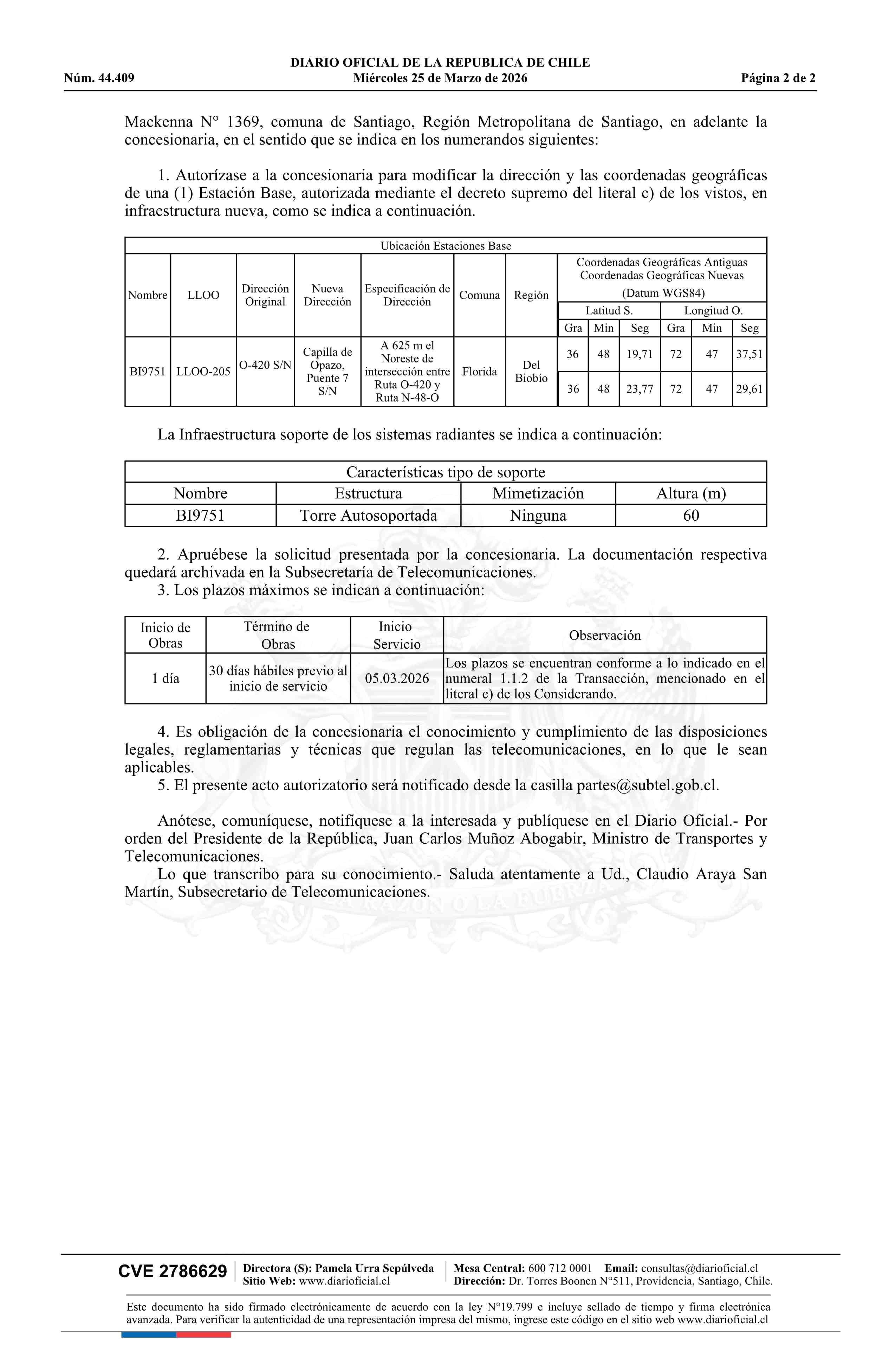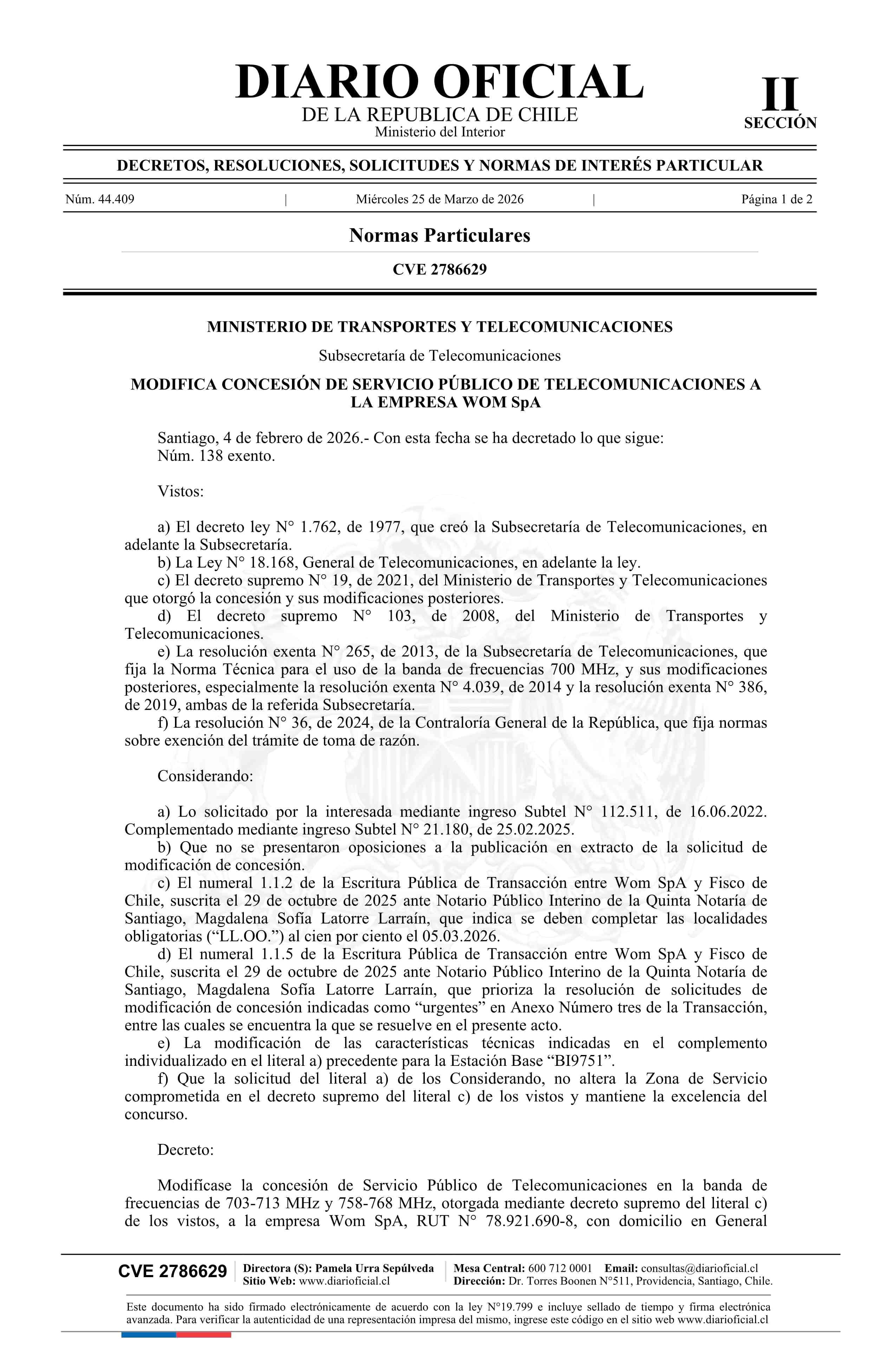 Título: Decreto exento número 138, de 2026.- Modifica concesión de servicio público de telecomunicaciones a la empresa Wom SpA