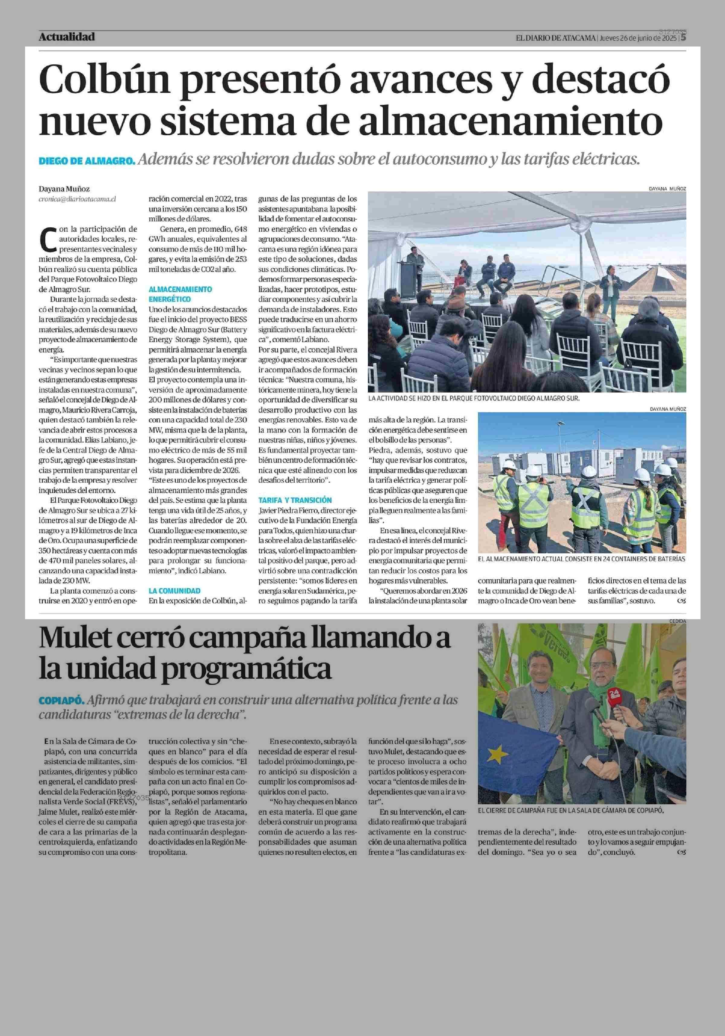 Colbún presentó avances y destacó nuevo sistema de almacenamiento 26-06-2025 El Diario de Atacama |