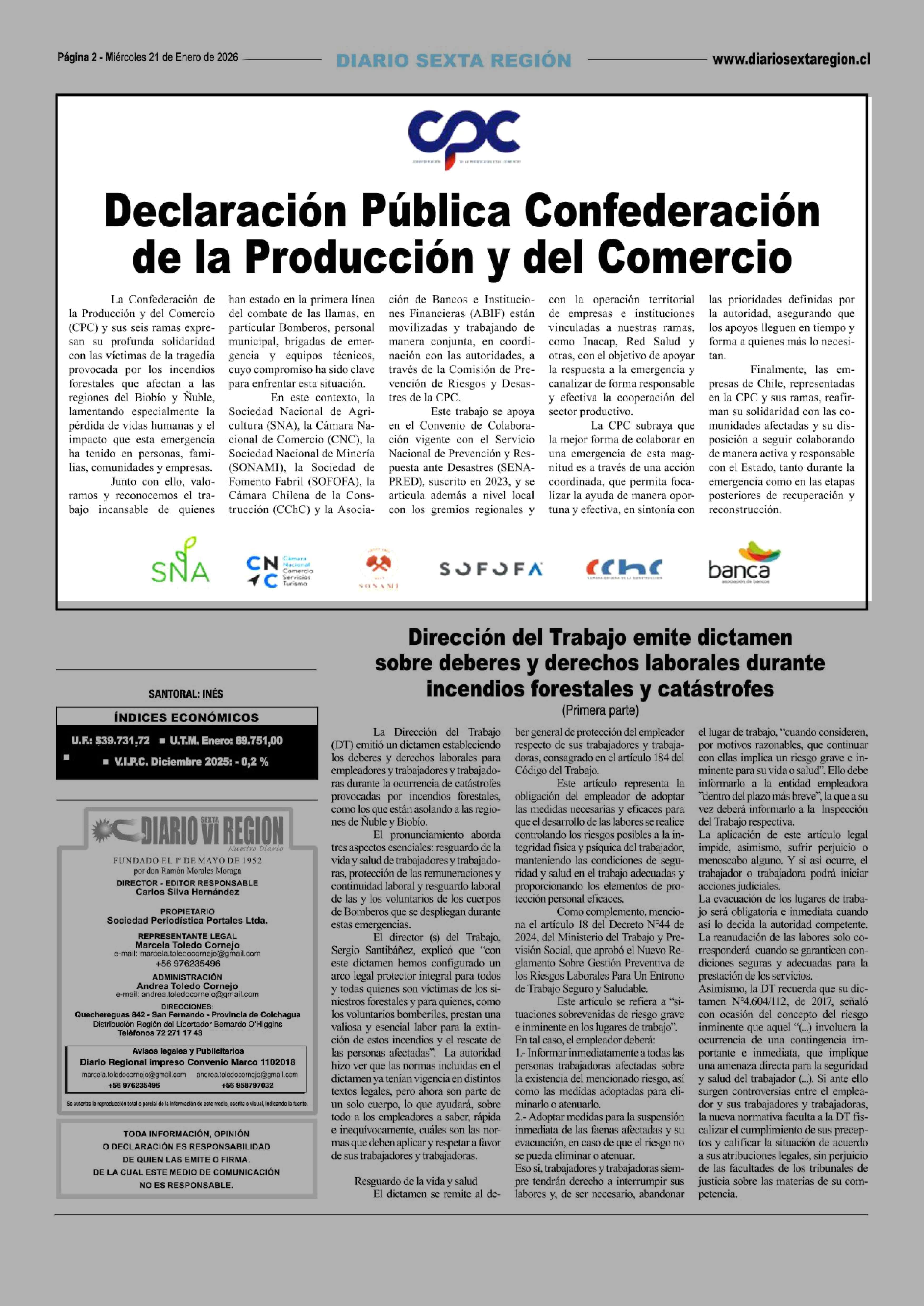 Declaración Pública Confederación de la Producción y del Comercio 21-01-2026 Diario VI Región |