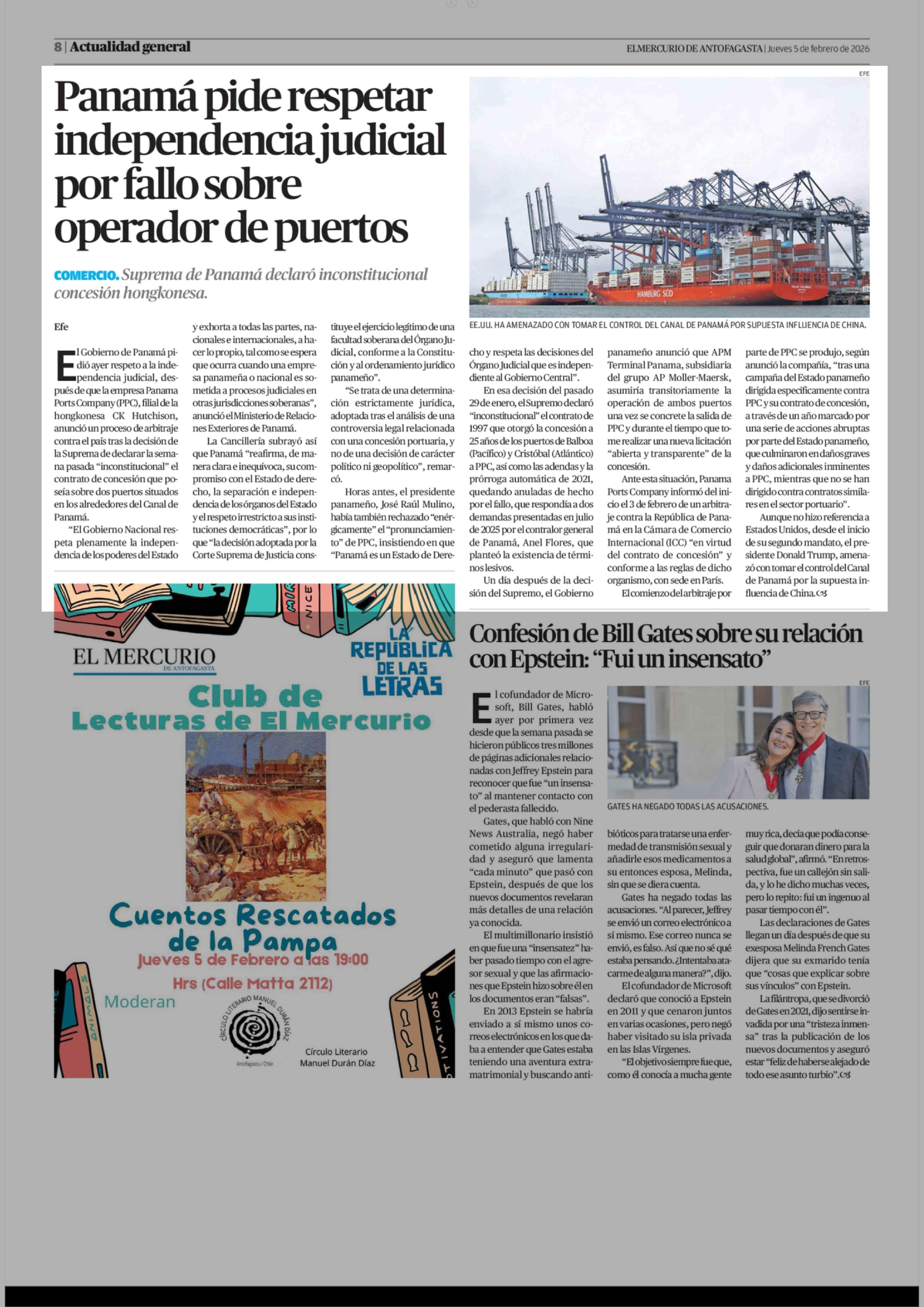 Panamá pide respetar independencia judicial por fallo sobre operador de puertos 05-02-2026 El Mercurio de Antofagasta |