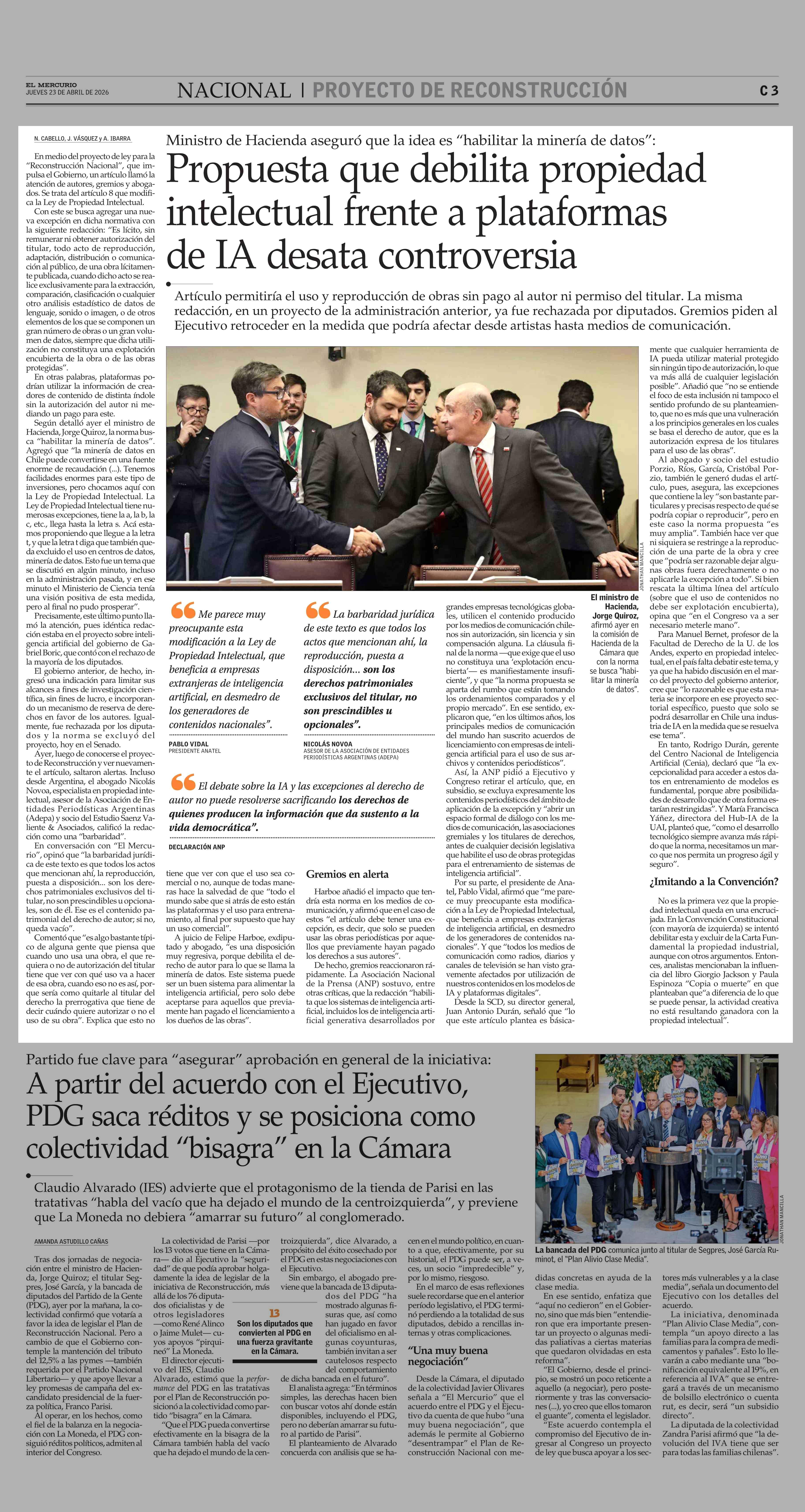Propuesta que debilita propiedad intelectual frente a plataformas de IA desata controversia 23-04-2026 El Mercurio |