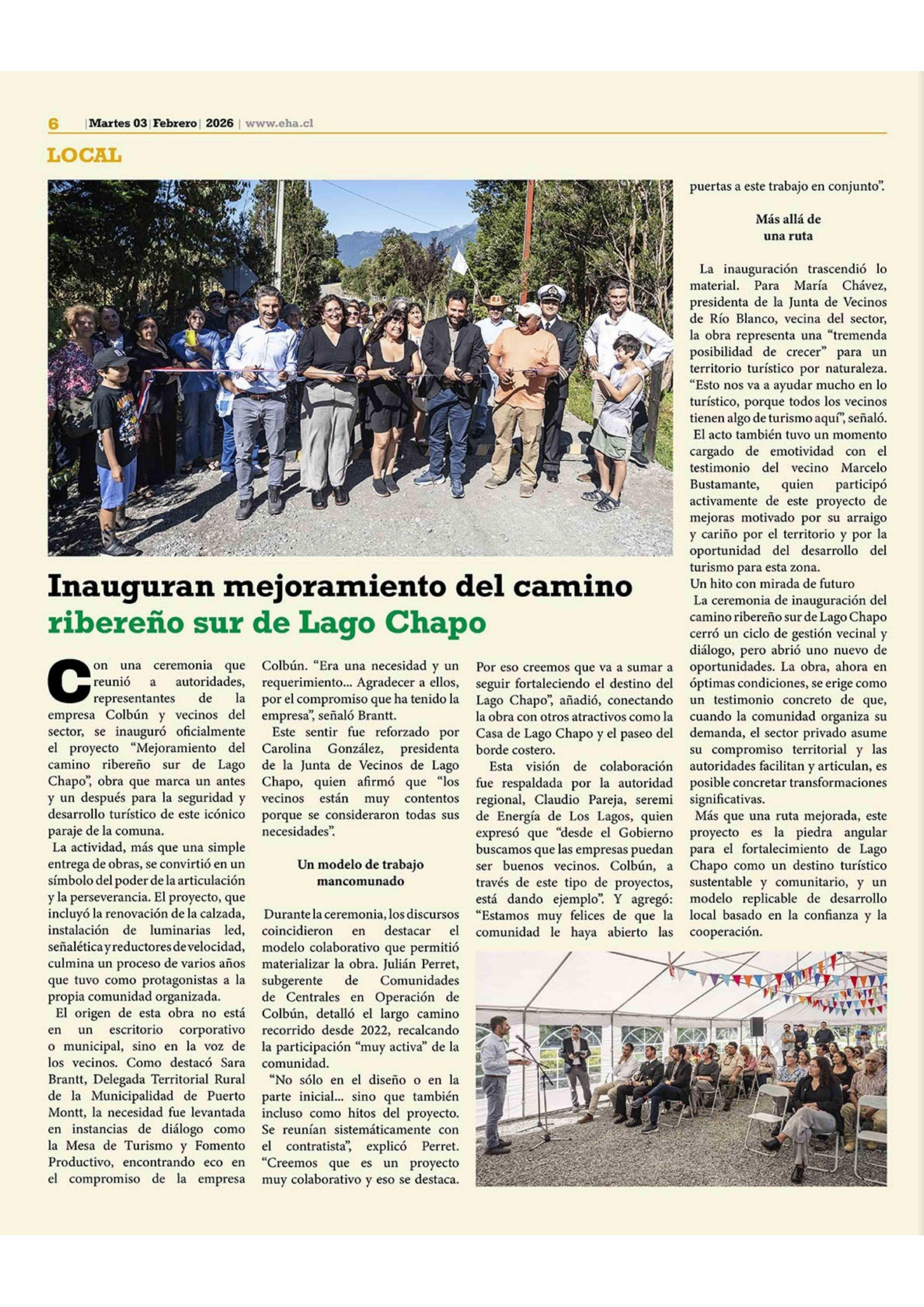 Inauguran mejoramiento del camino ribereño sur de Lago Chapo 03-02-2026 El Heraldo Austral |