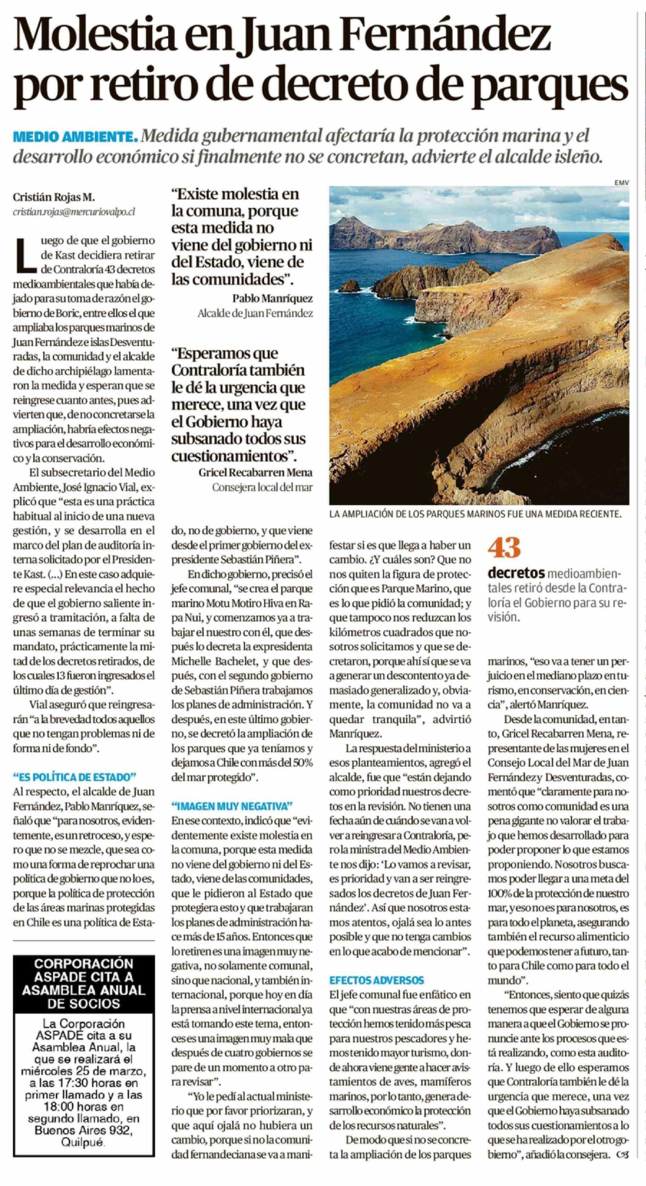 Molestia en Juan Fernández por retiro de decreto de parques 19-03-2026 El Mercurio de Valparaíso |