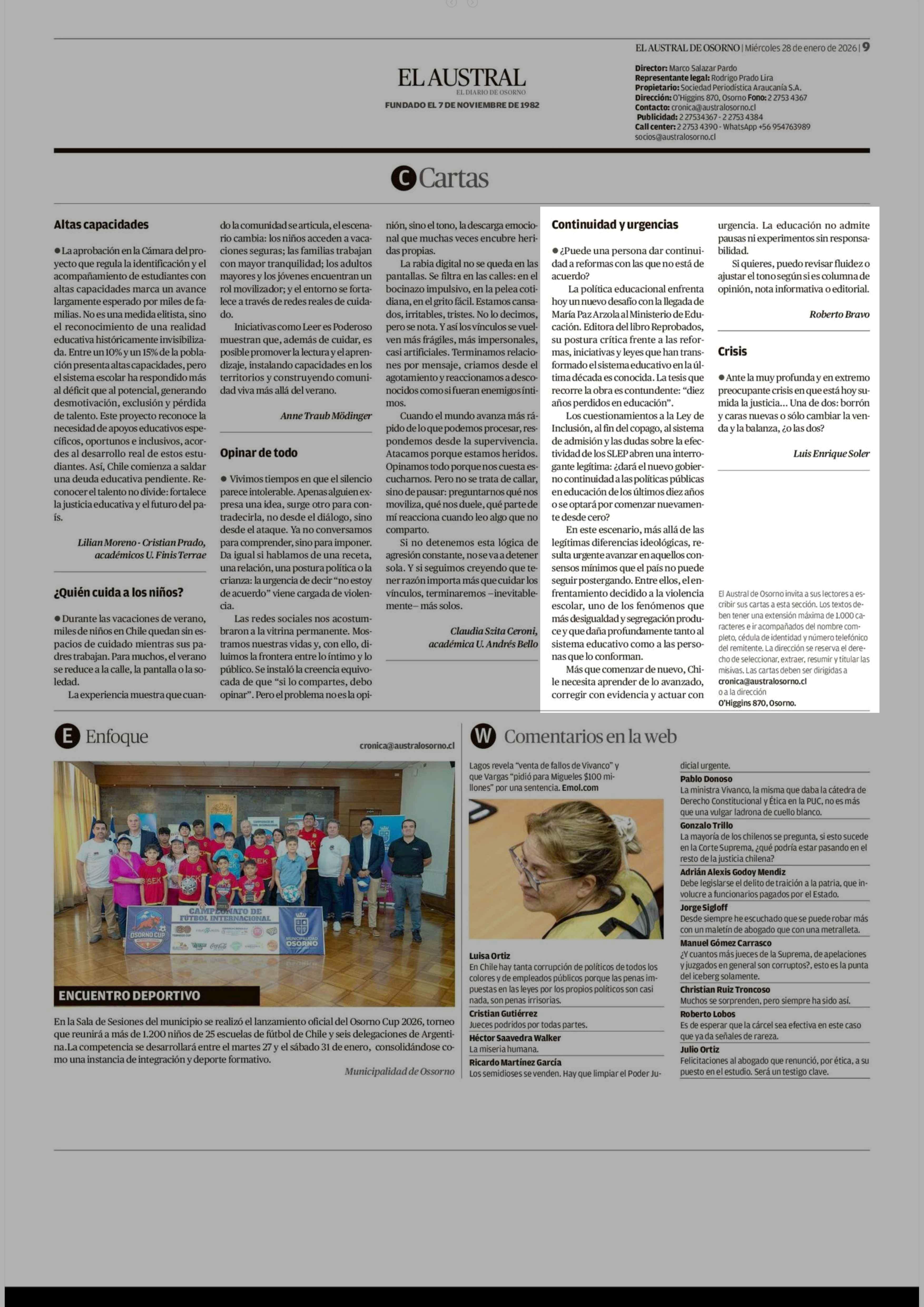 Cartas: Continuidad y urgencias 28-01-2026 El Austral de Osorno |