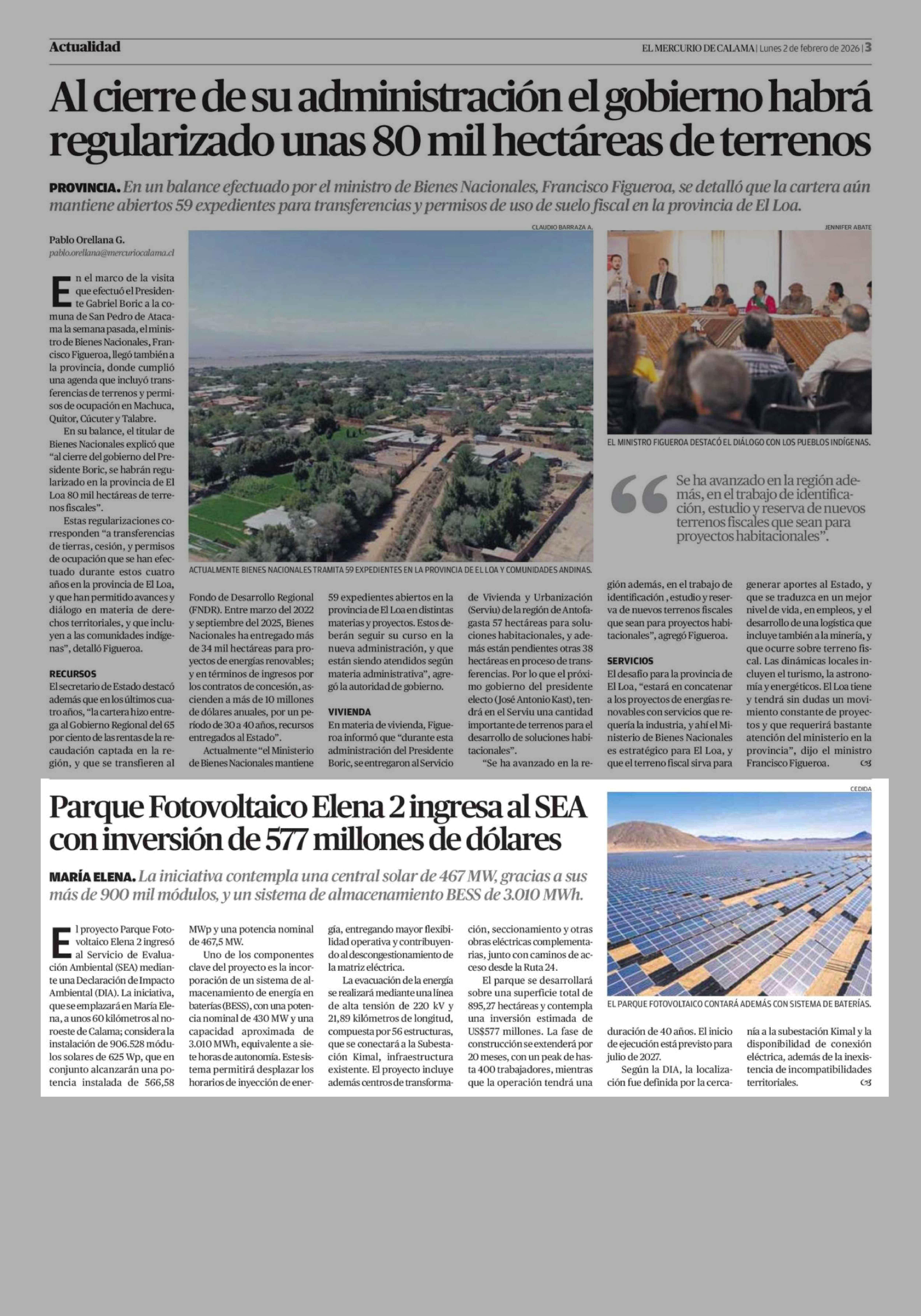Parque Fotovoltaico Elena 2 ingresa al SEA con inversión de 577 millones de dólares 02-02-2026 El Mercurio de Calama |
