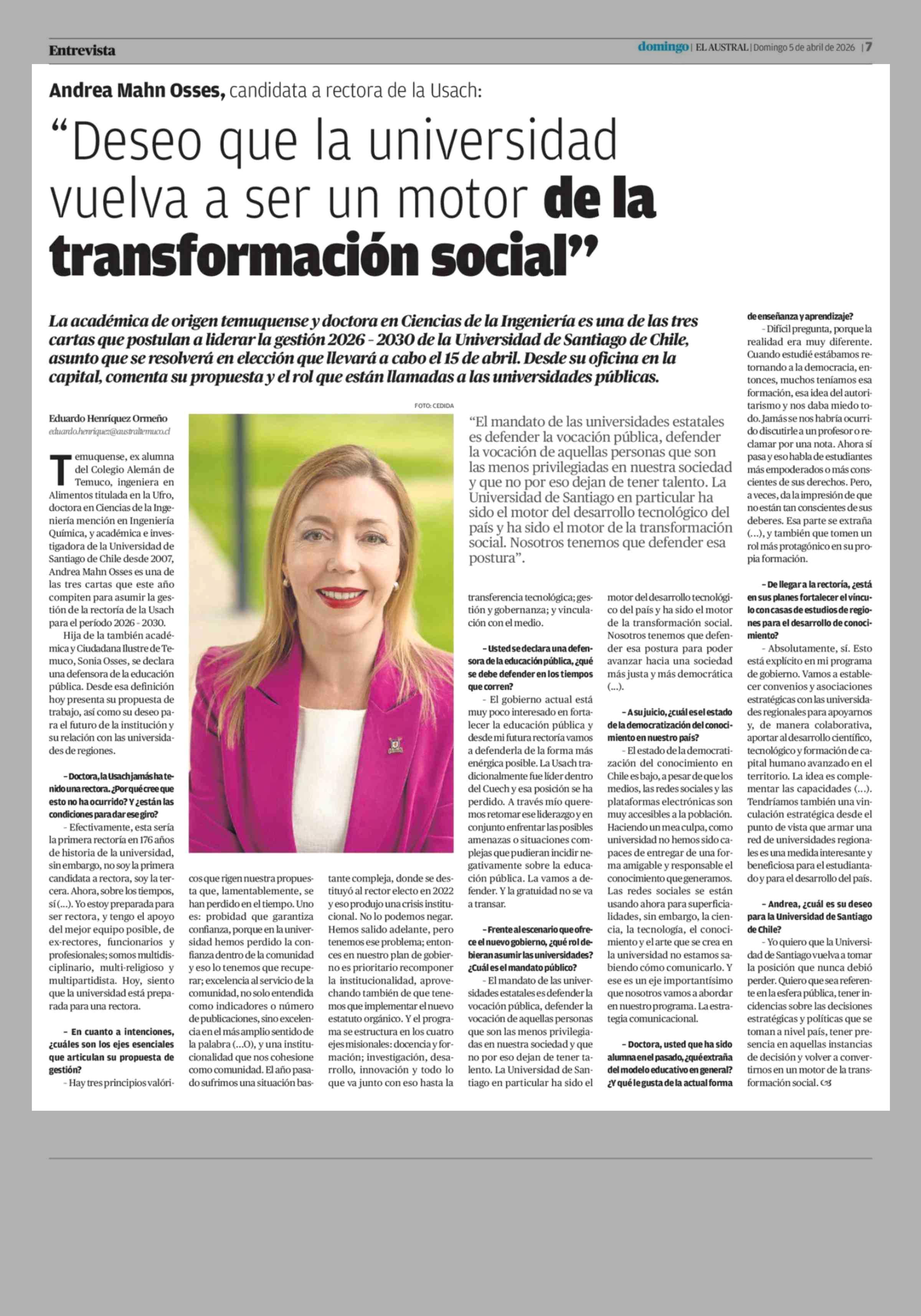 Título: "Deseo que la universidad vuelva a ser un motor de la transformación social"
