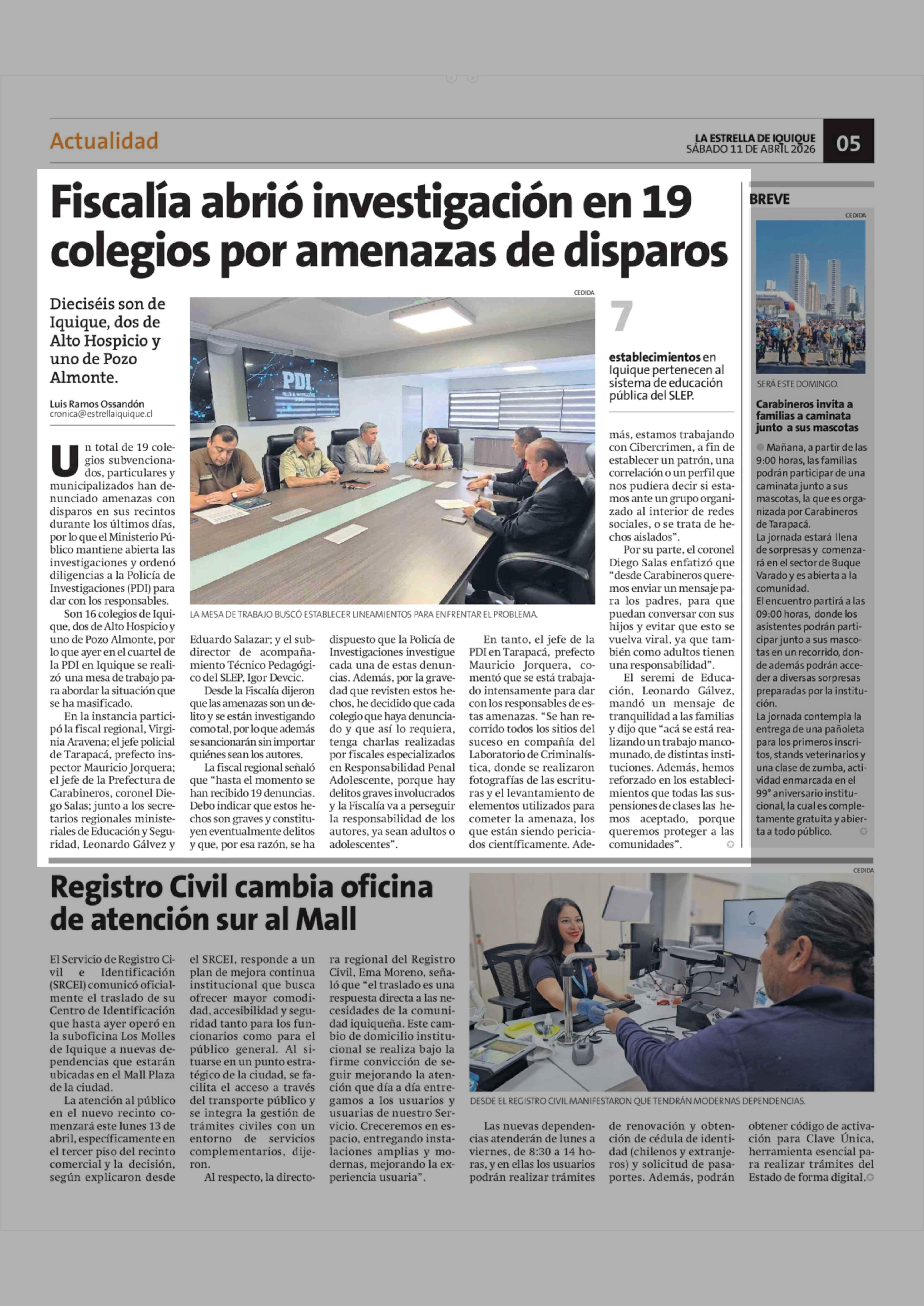 Fiscalía abrió investigación en 19 colegios por amenazas de disparos 11-04-2026 La Estrella de Iquique |