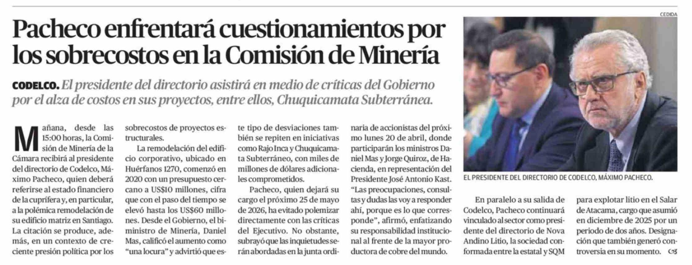 Pacheco enfrentará cuestionamientos por los sobrecostos en la Comisión de Minería 14-04-2026 El Mercurio de Calama |