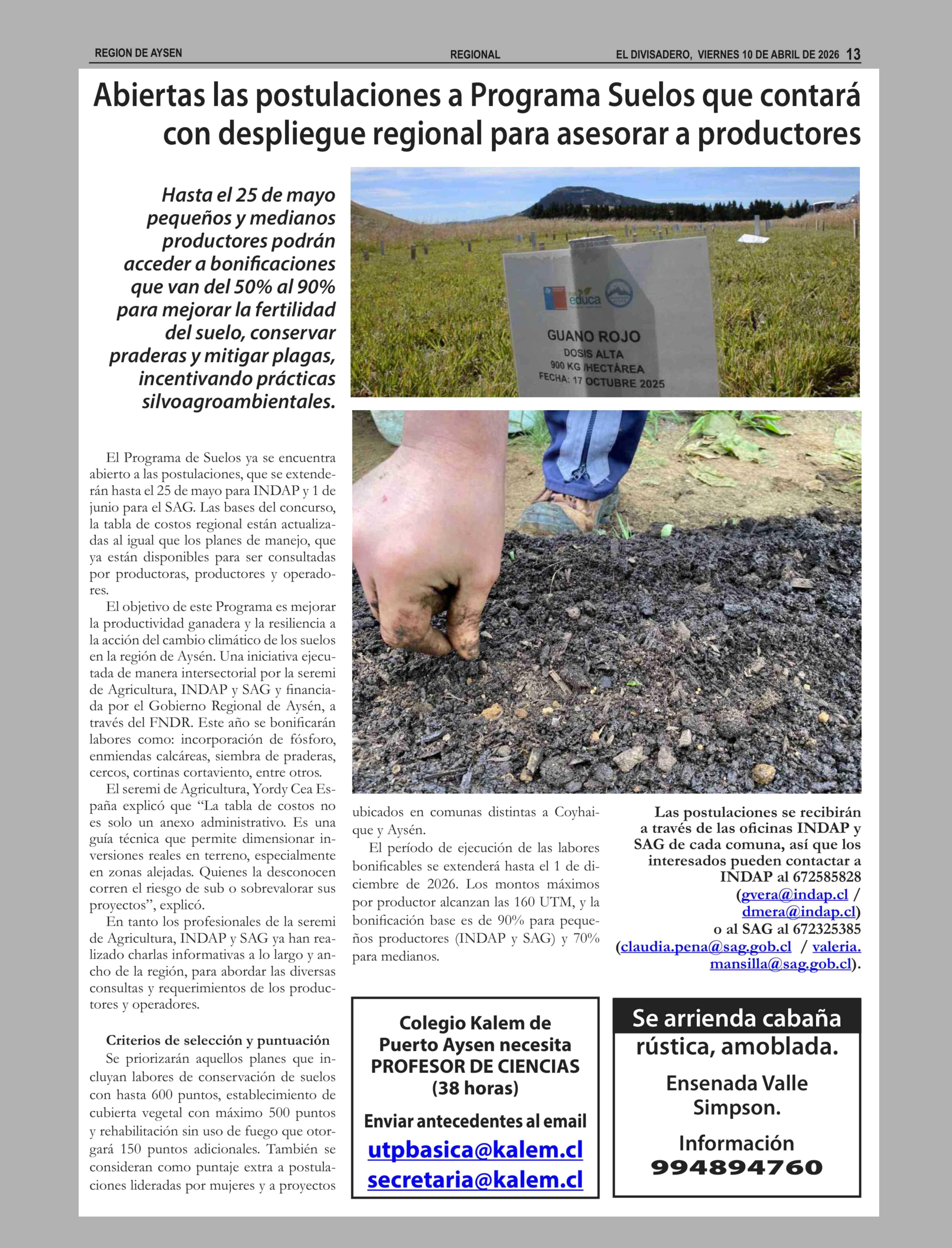 Abiertas las postulaciones a Programa Suelos que contará con despliegue regional para asesorar a productores 10-04-2026 El Divisadero |