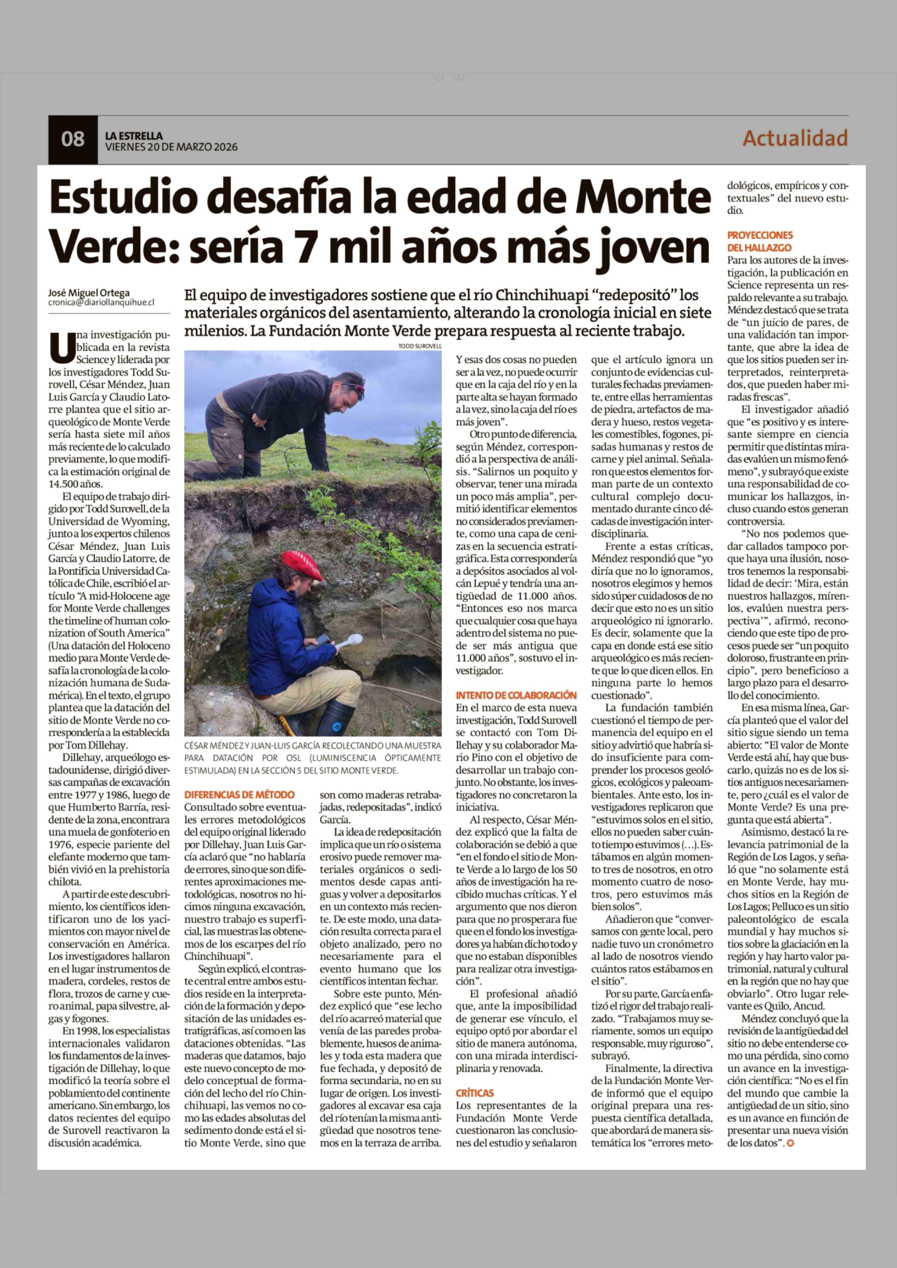 Estudio desafía la edad de Monte Verde: sería 7 mil años más joven 20-03-2026 La Estrella de Chiloé |