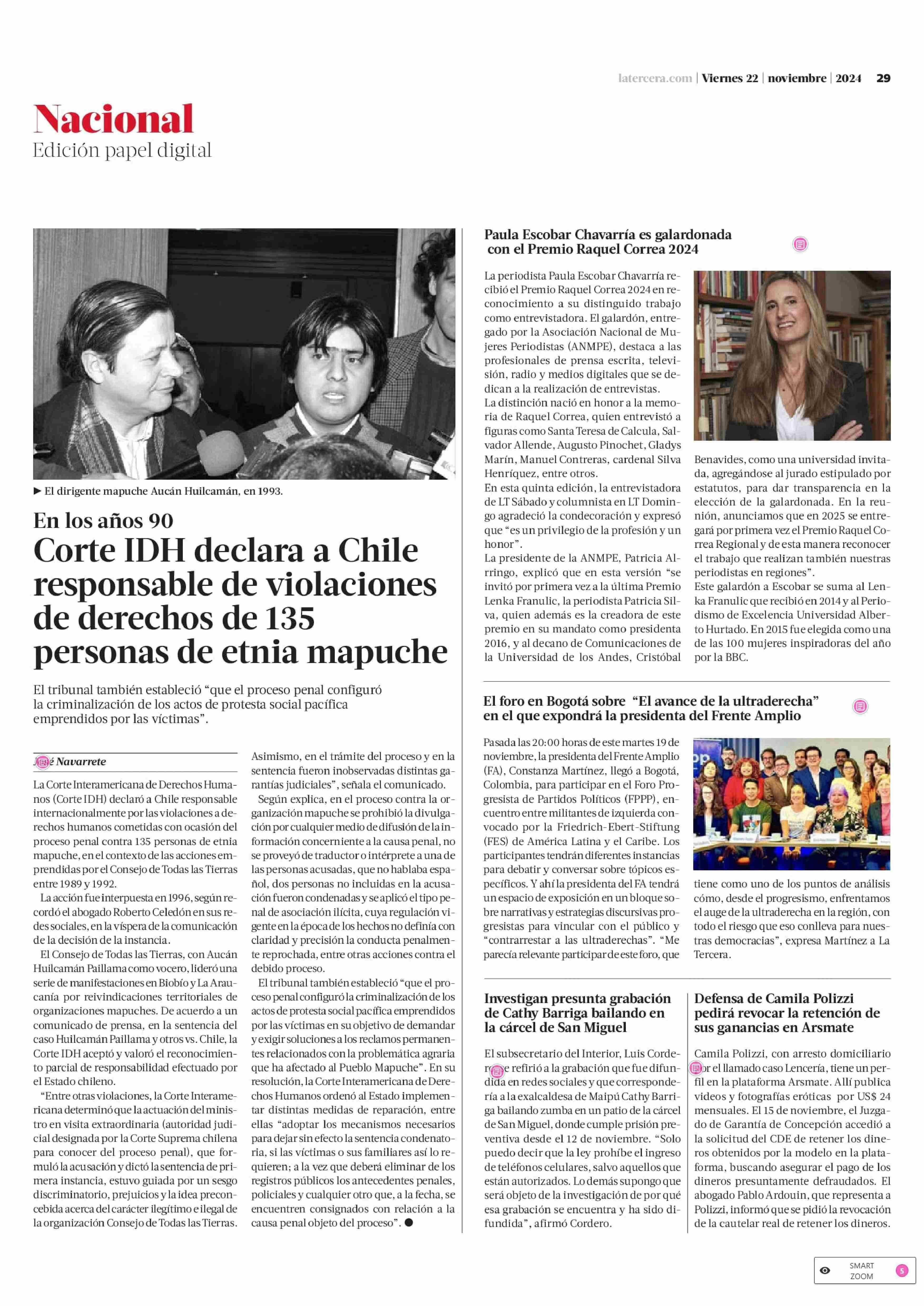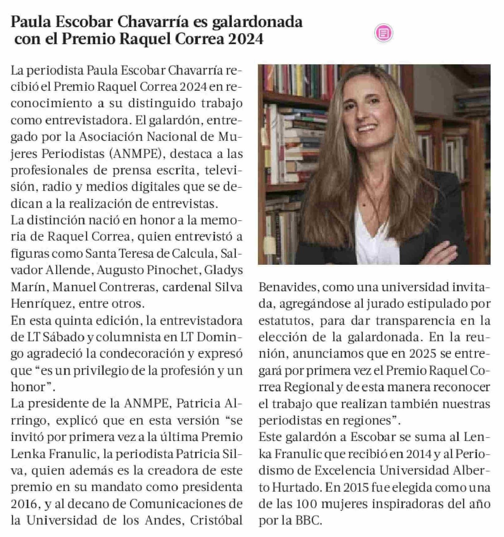 Paula Escobar Chavarría es galardonada con el Premio Raquel Correa 2024 22-11-2024 La Tercera |