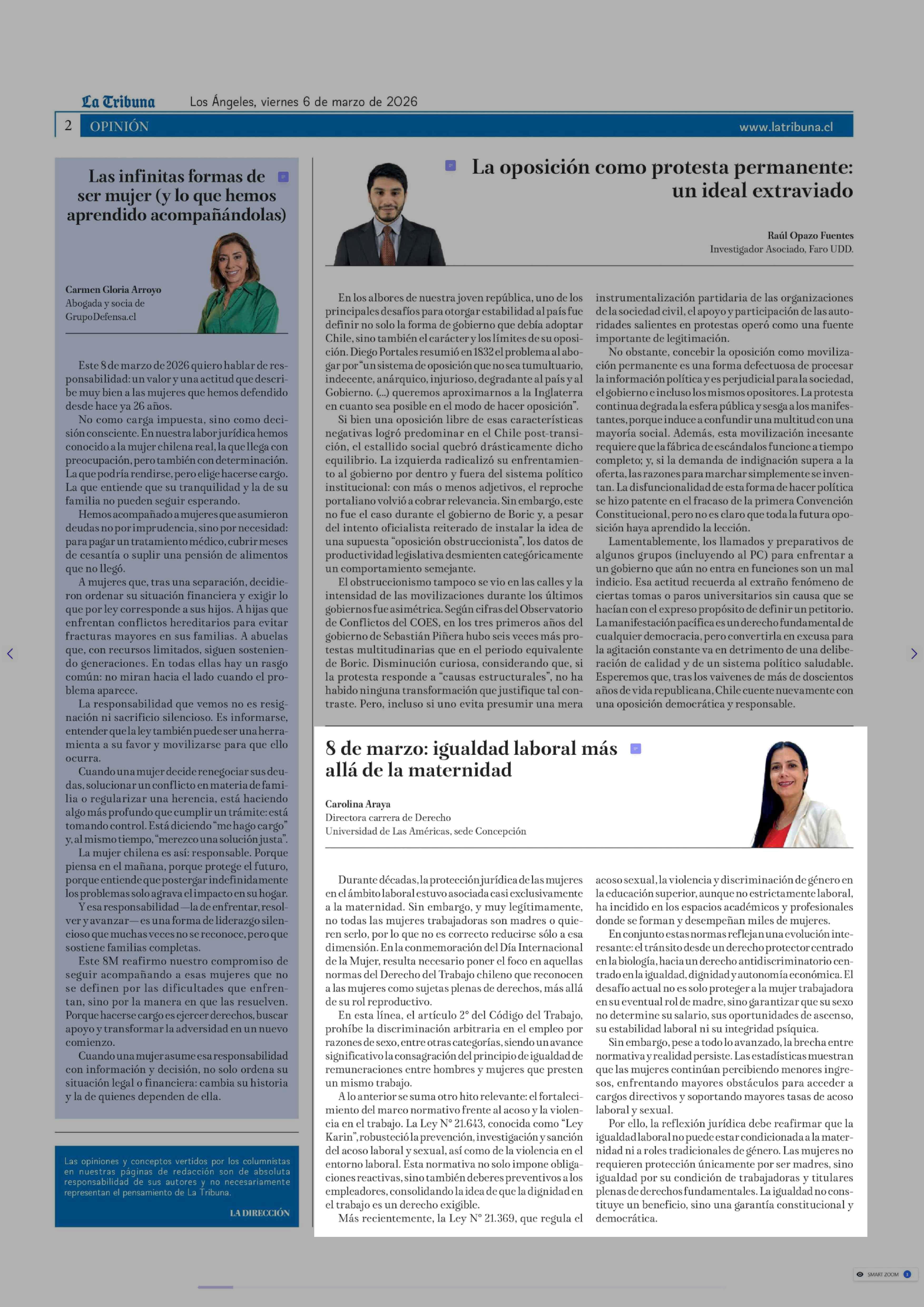 Columnas de Opinión: 8 De marzo: igualdad laboral más allá de la maternidad 06-03-2026 La Tribuna |