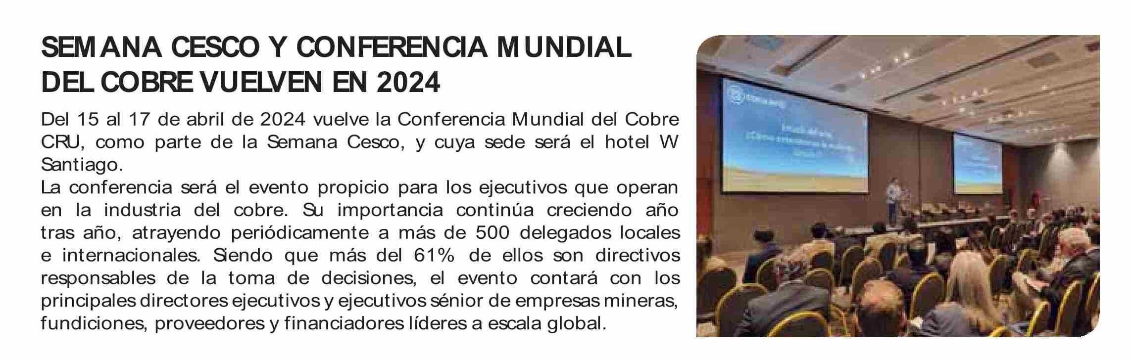 | Título: | SEMANA CESCO Y CONFERENCIA MUNDIAL DEL COBRE VUELVEN EN 2024 |