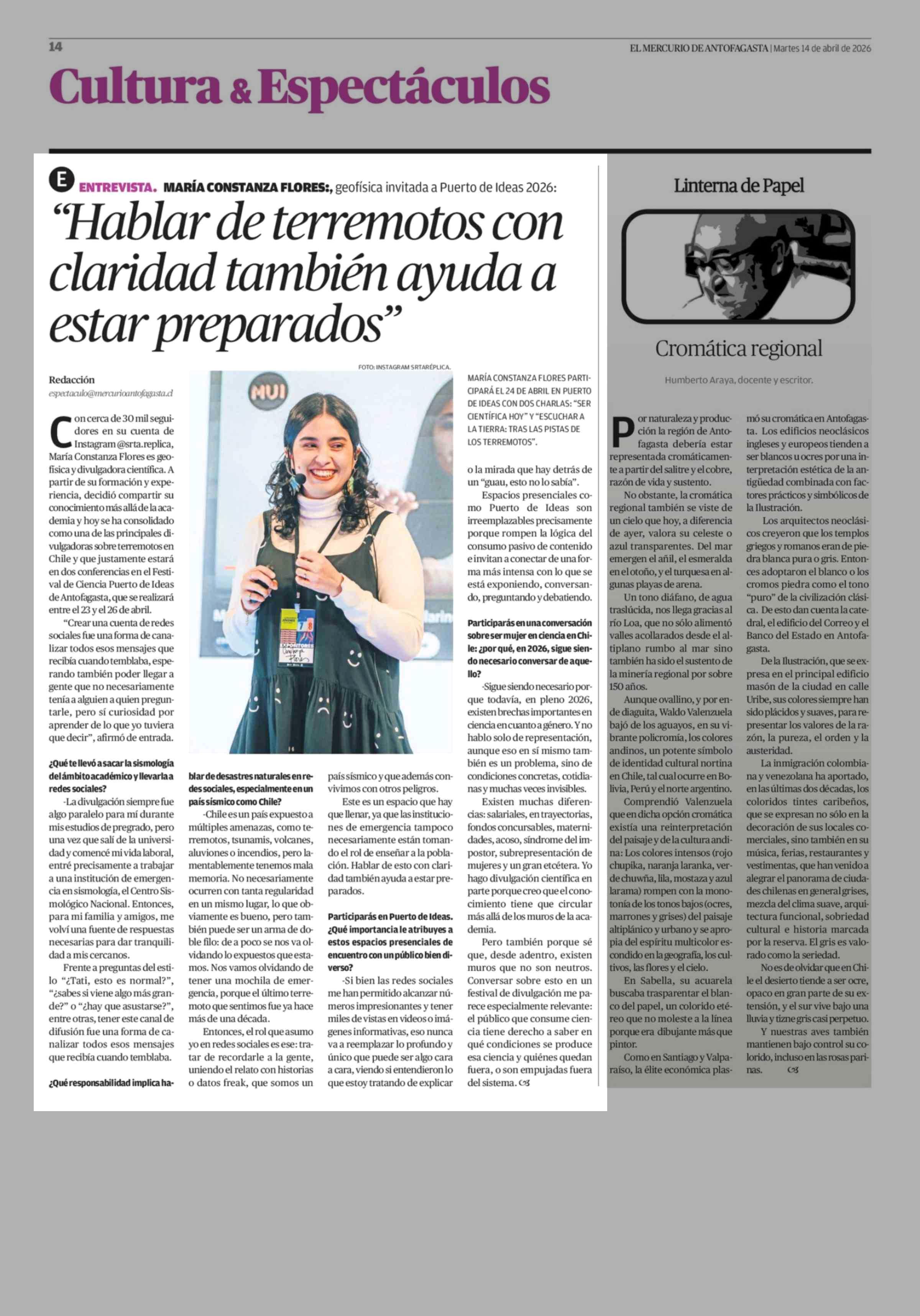 "Hablar de terremotos con claridad también ayuda a estar preparados" 14-04-2026 El Mercurio de Antofagasta |