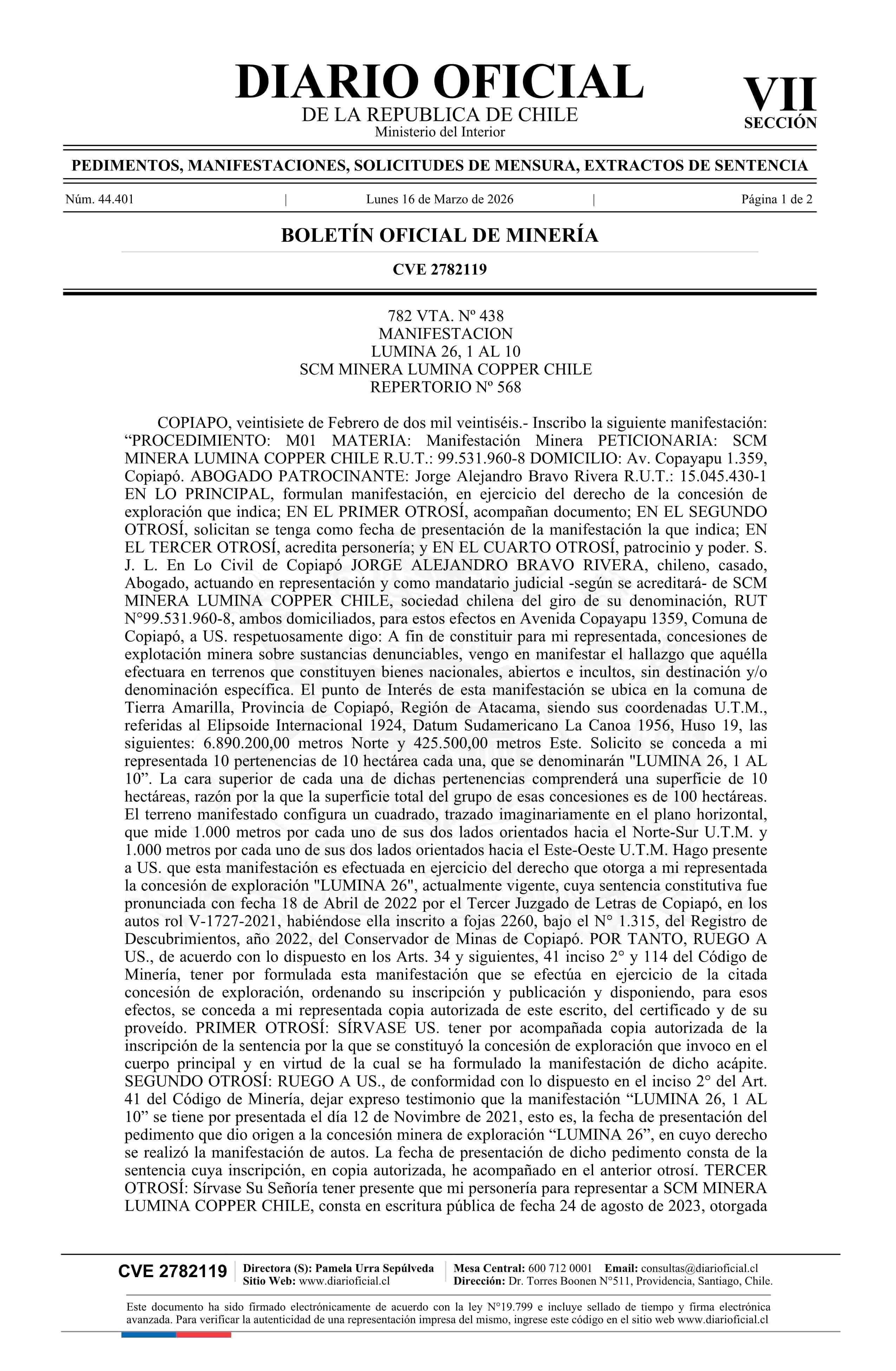 Título: LUMINA 26, 1 AL 10 / SCM Minera Lumina Copper Chile