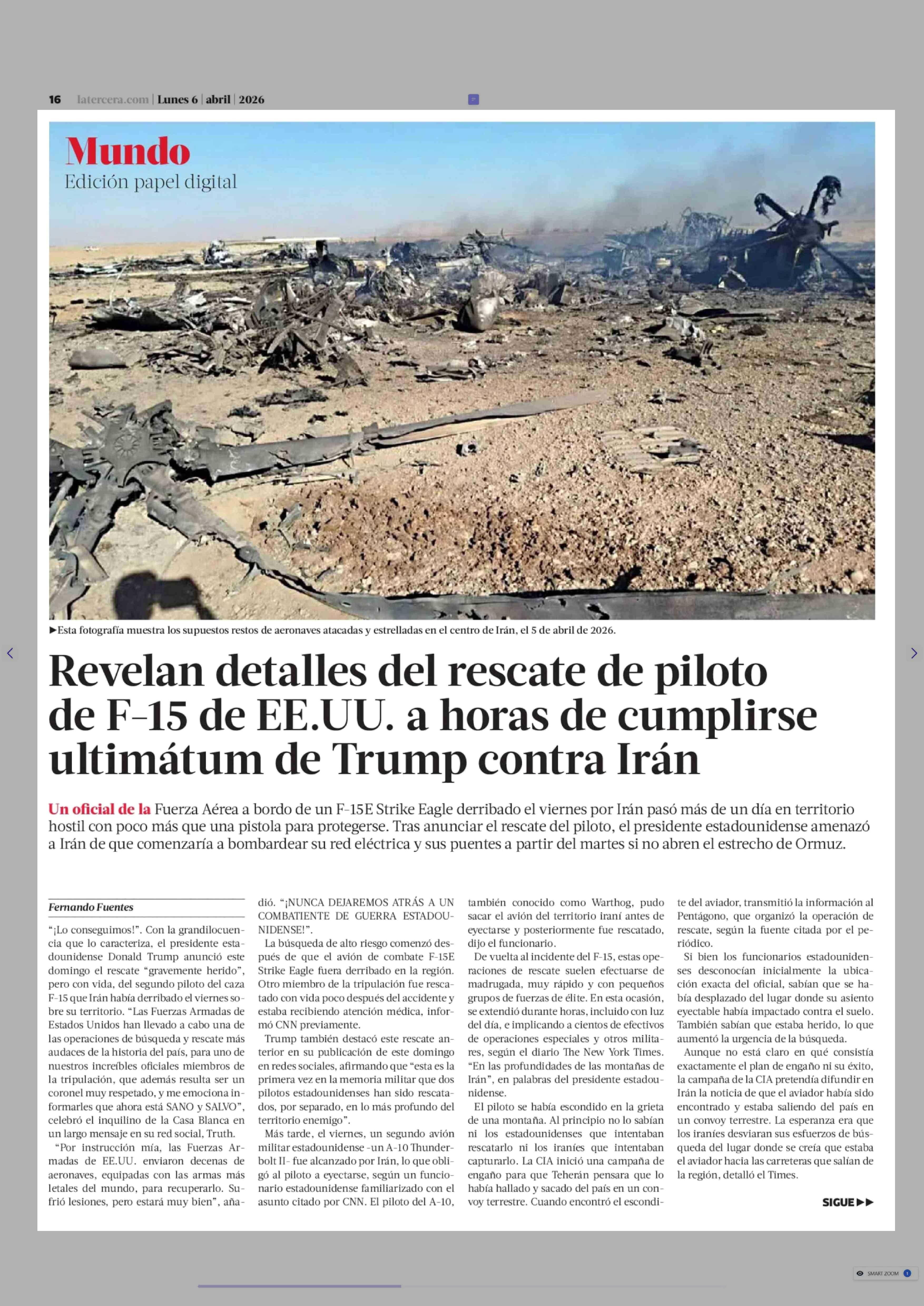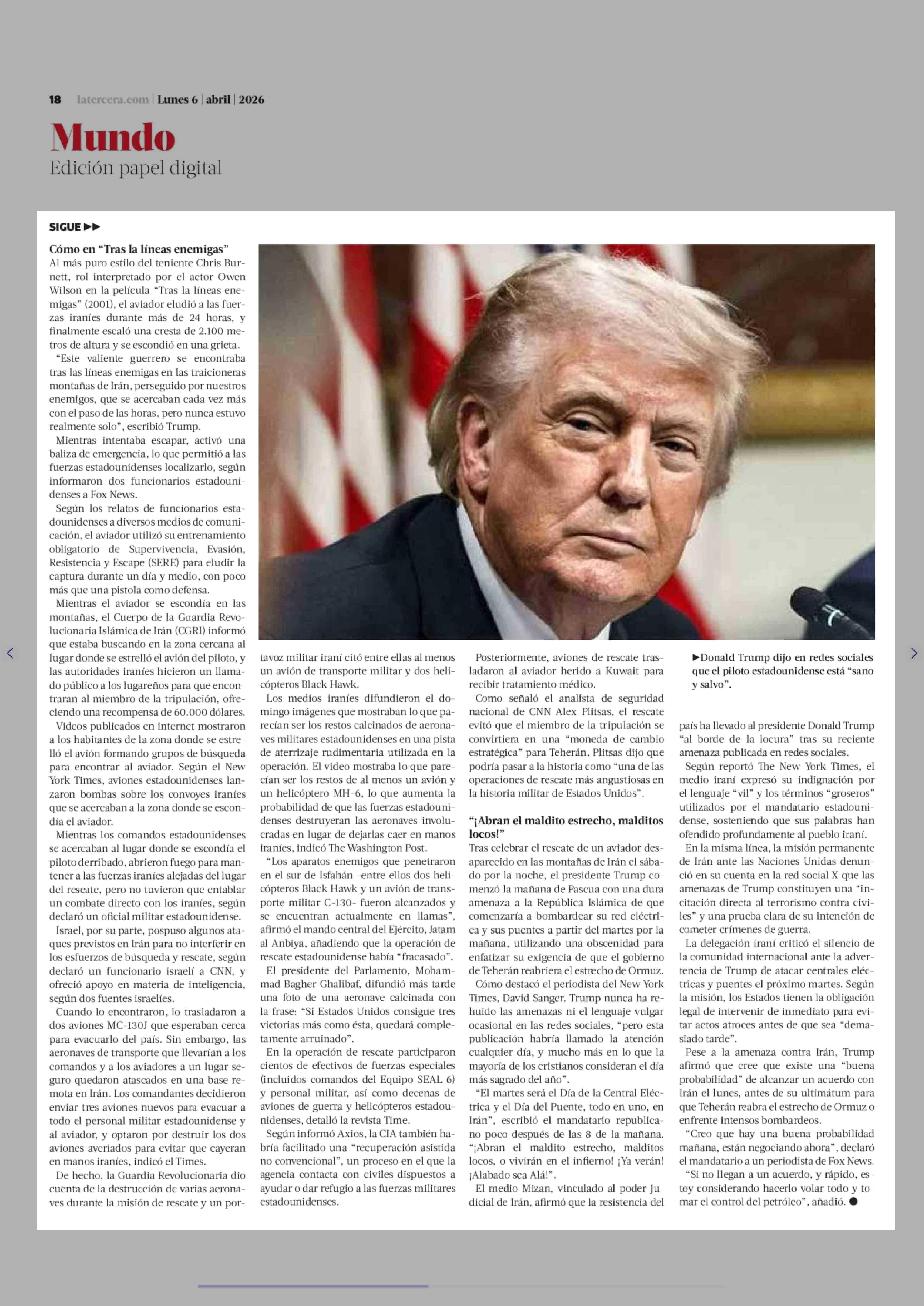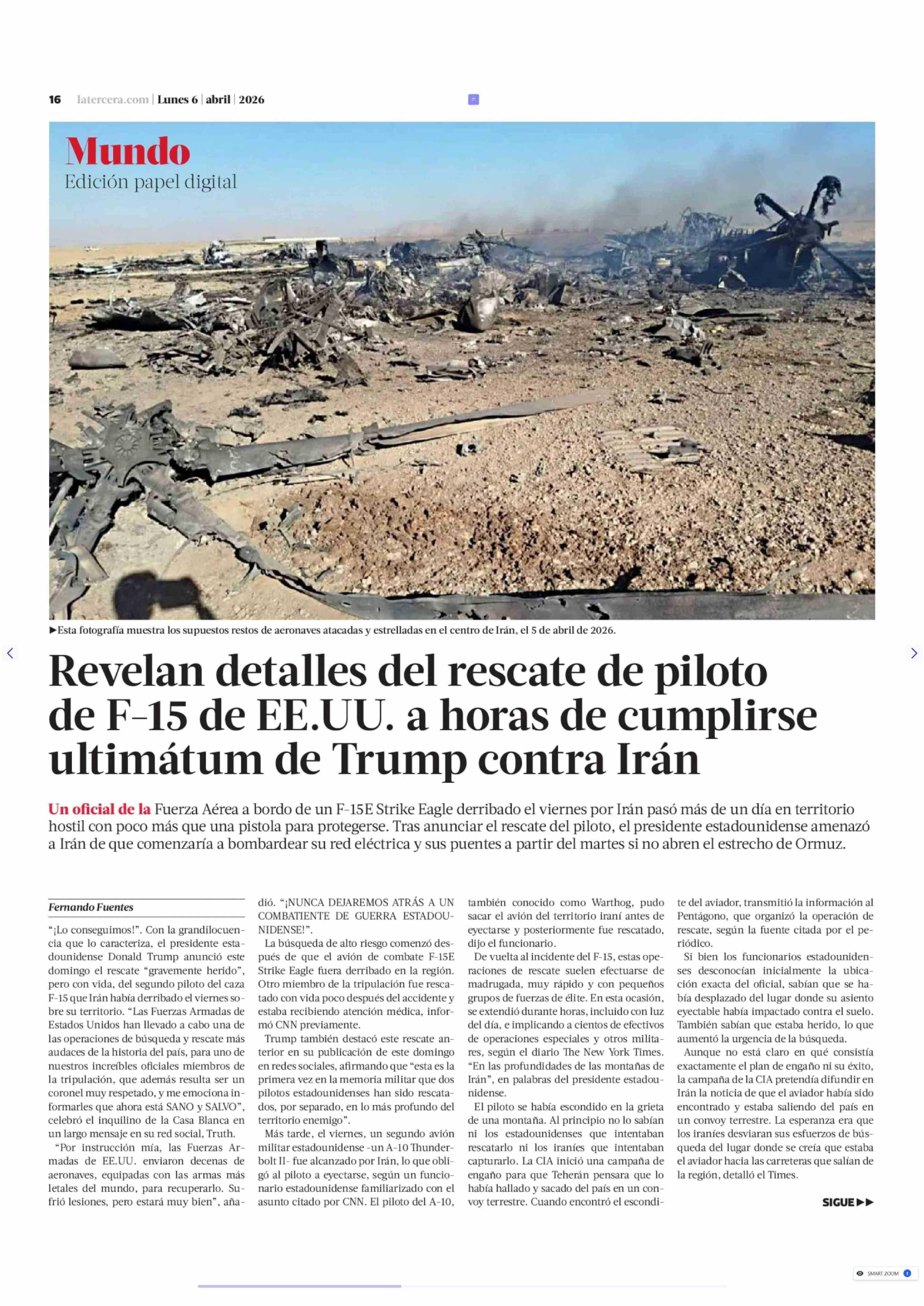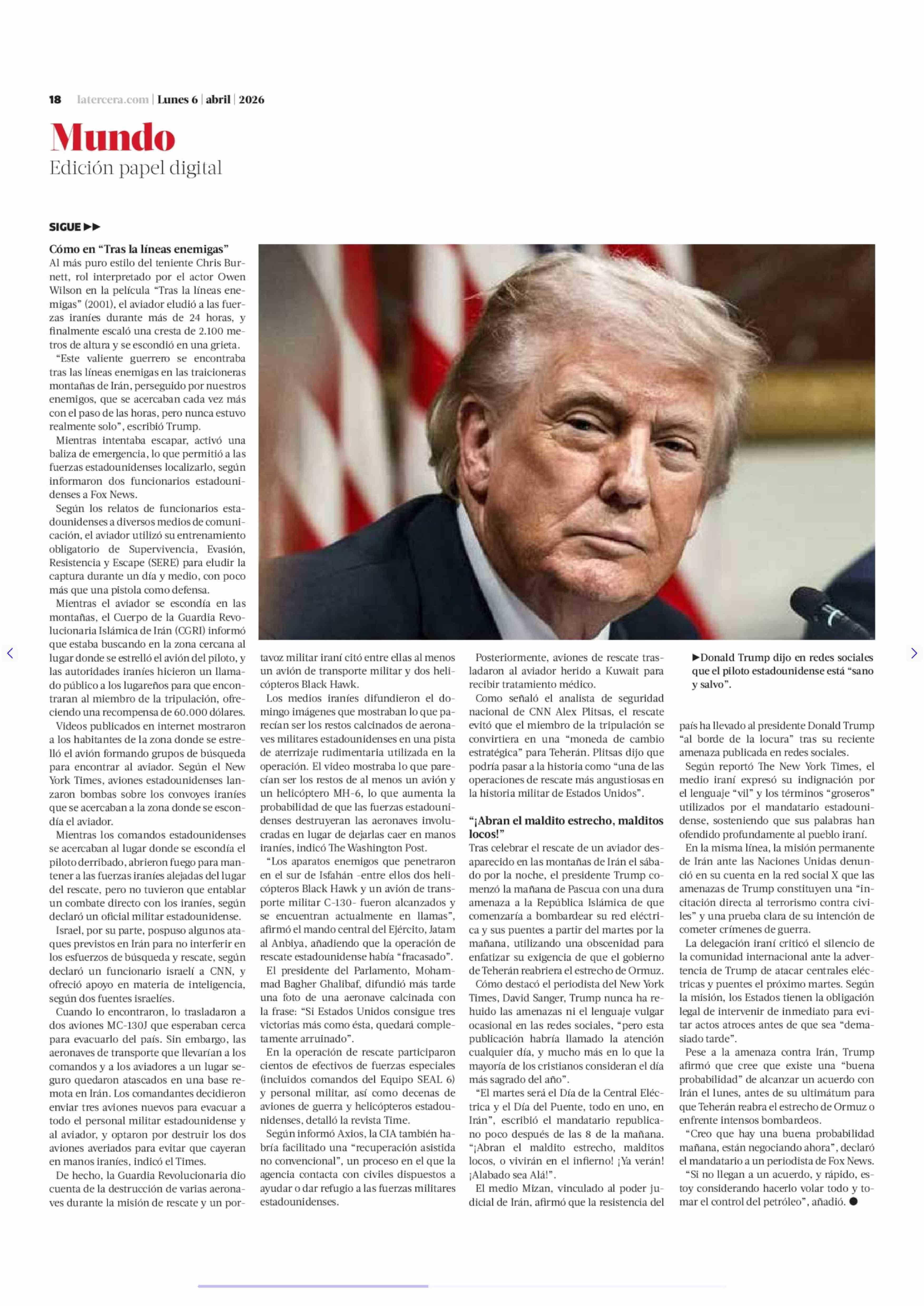 Revelan detalles del rescate de piloto de F-15 de EE.UU. a horas de cumplirse ultimátum de Trump contra Irán 06-04-2026 La Tercera |
