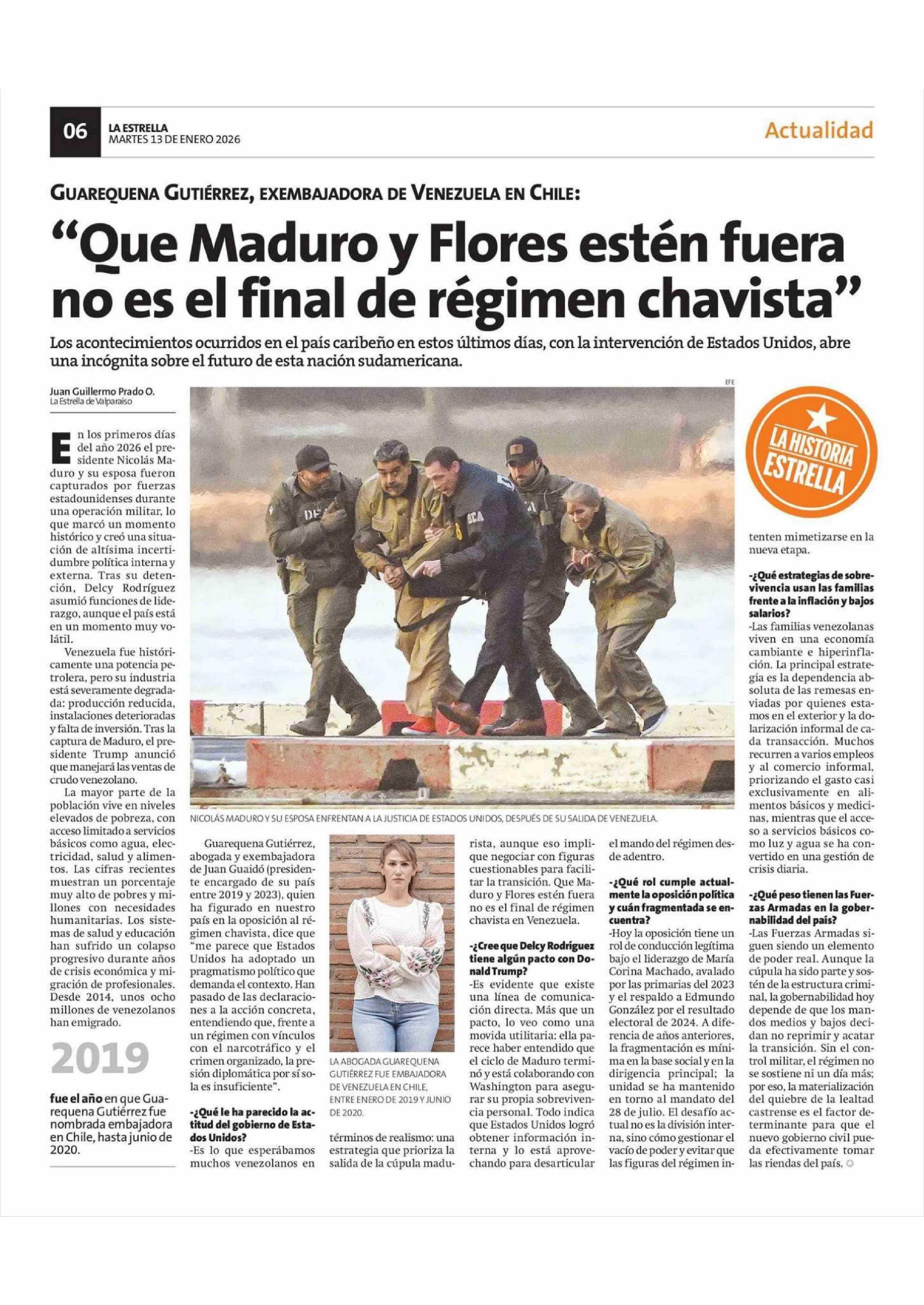 "Que Maduro y Flores estén fuera no es el final de régimen chavista" 13-01-2026 La Estrella de Concepción |
