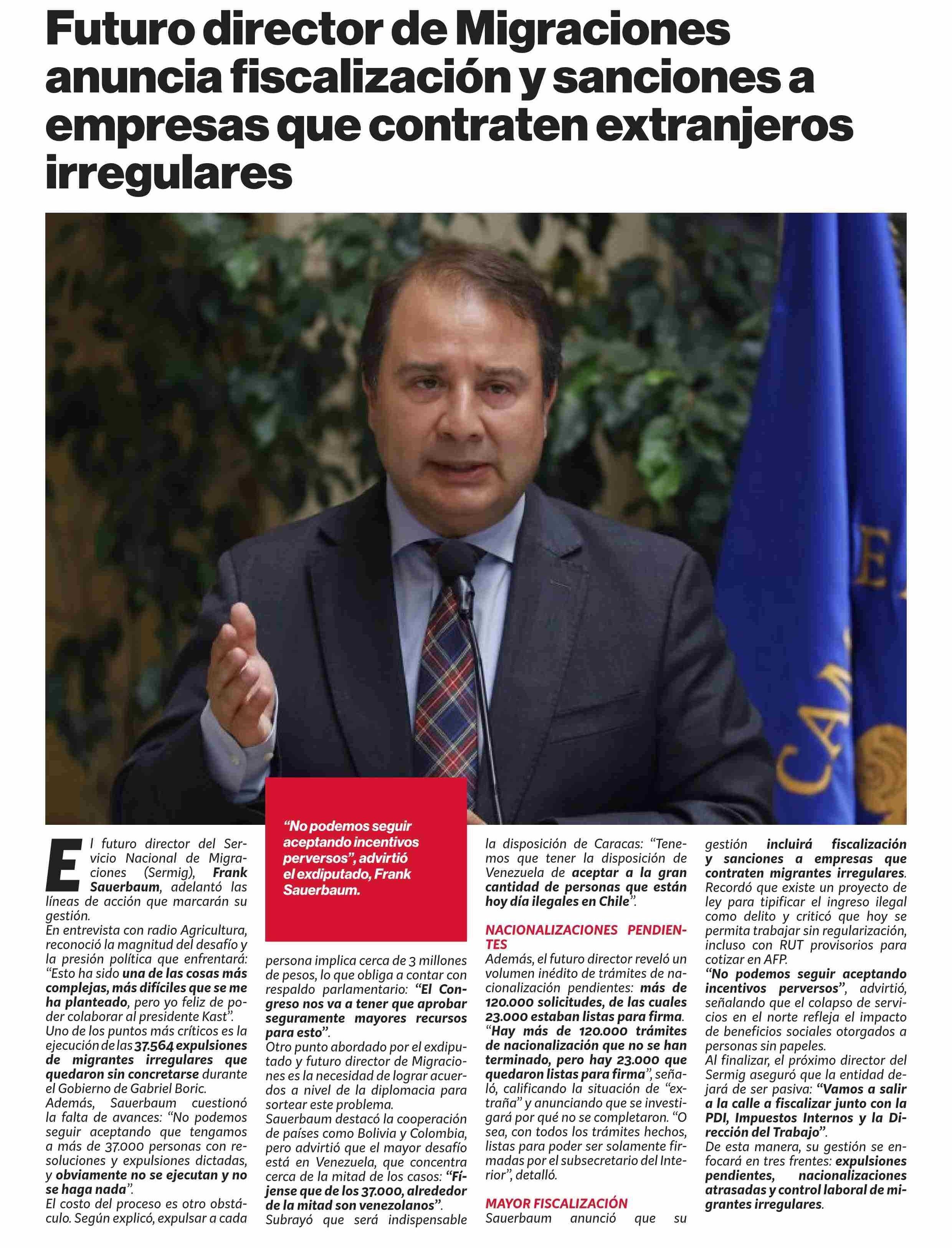 Futuro director de Migraciones anuncia fiscalización y sanciones a empresas que contraten extranjeros irregulares 16-03-2026 Puranoticia.cl |