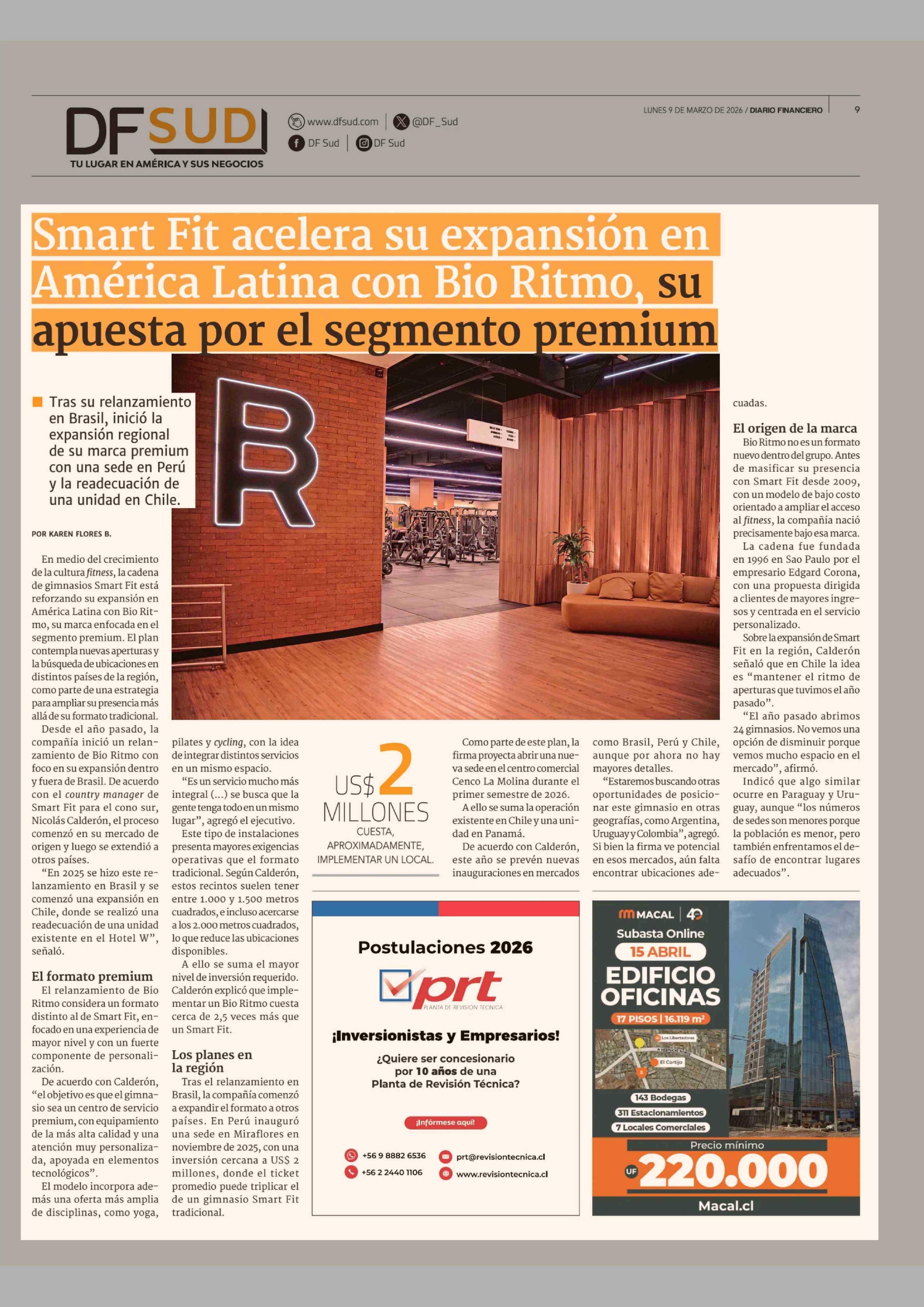Smart Fit acelera su expansión en América Latina con Bio Ritmo, su apuesta por el segmento premium 09-03-2026 Diario Financiero |