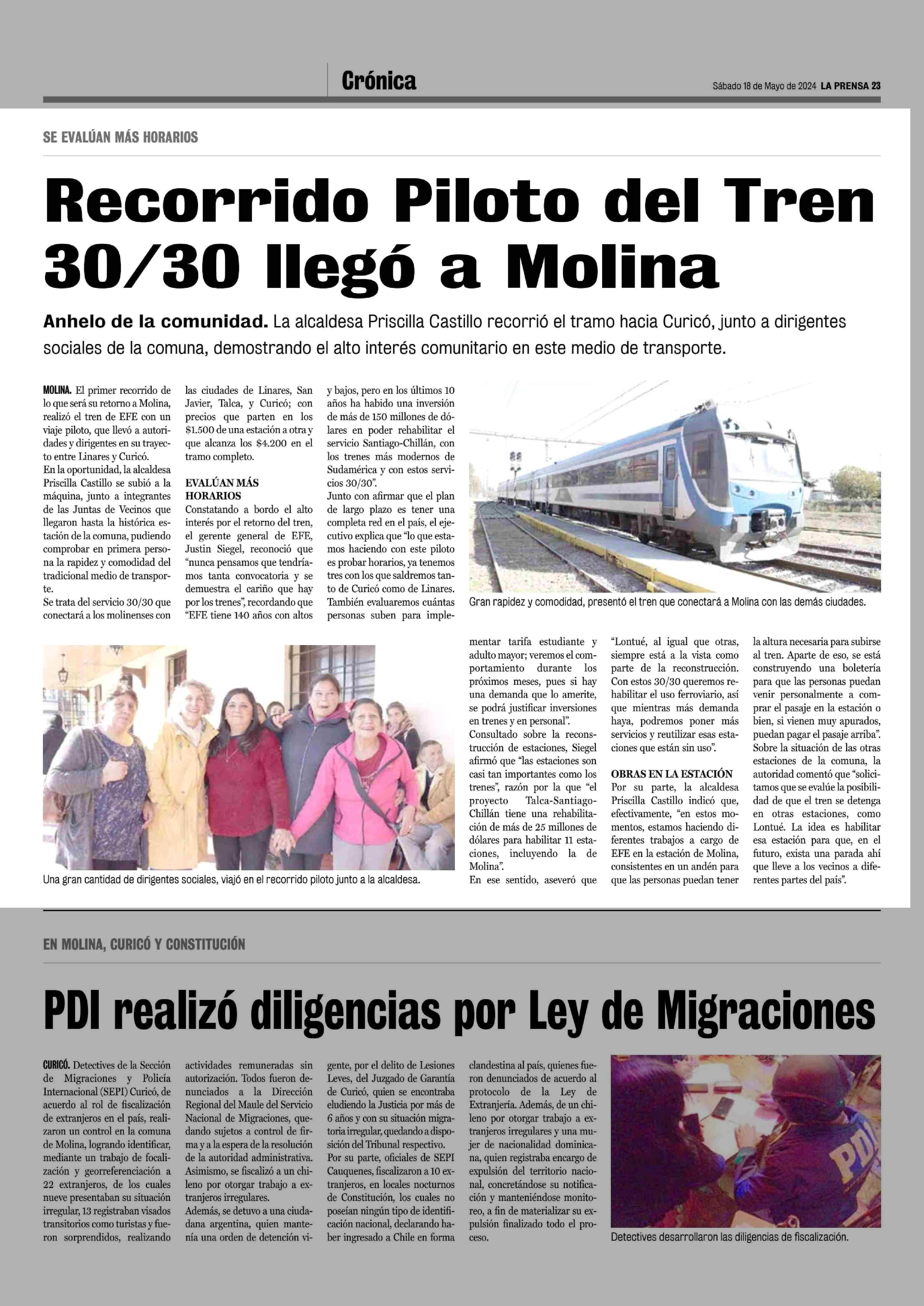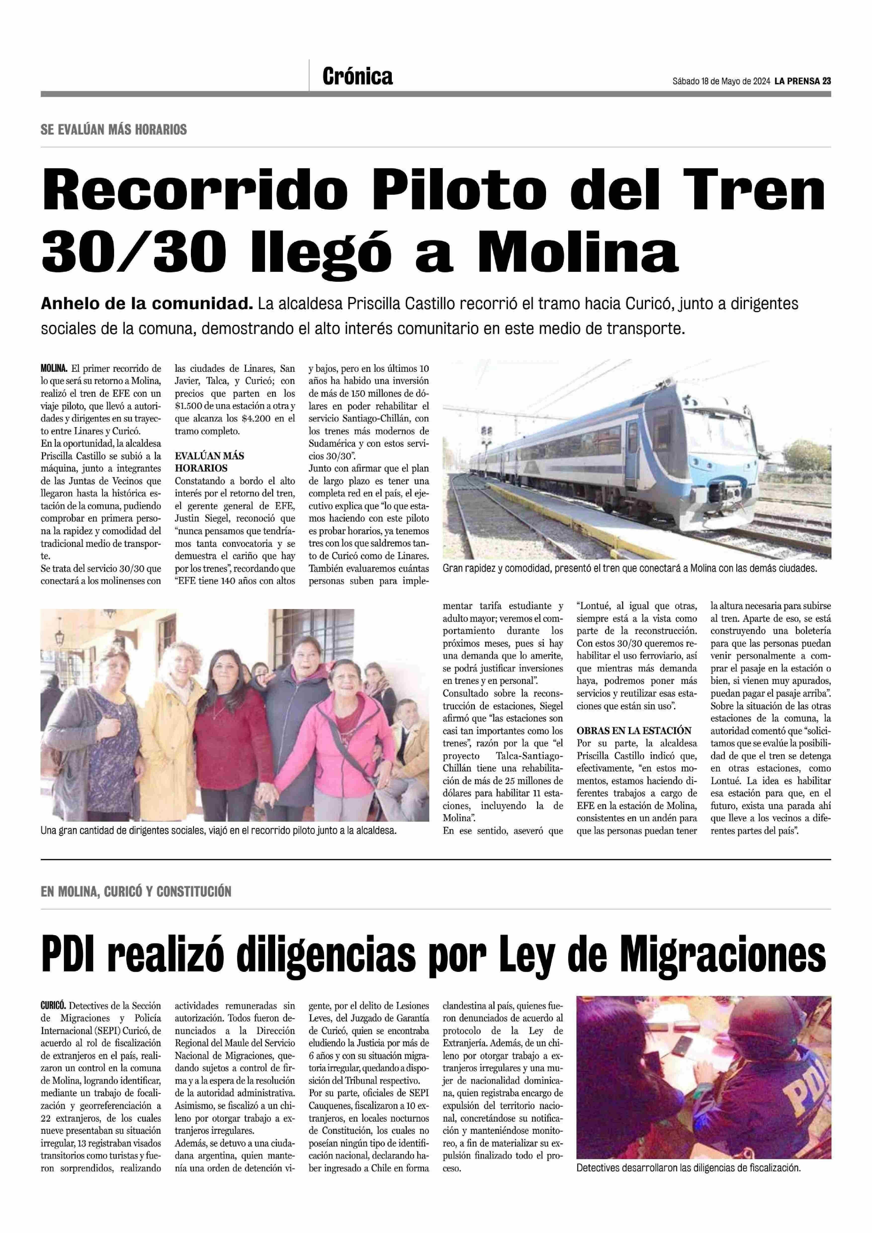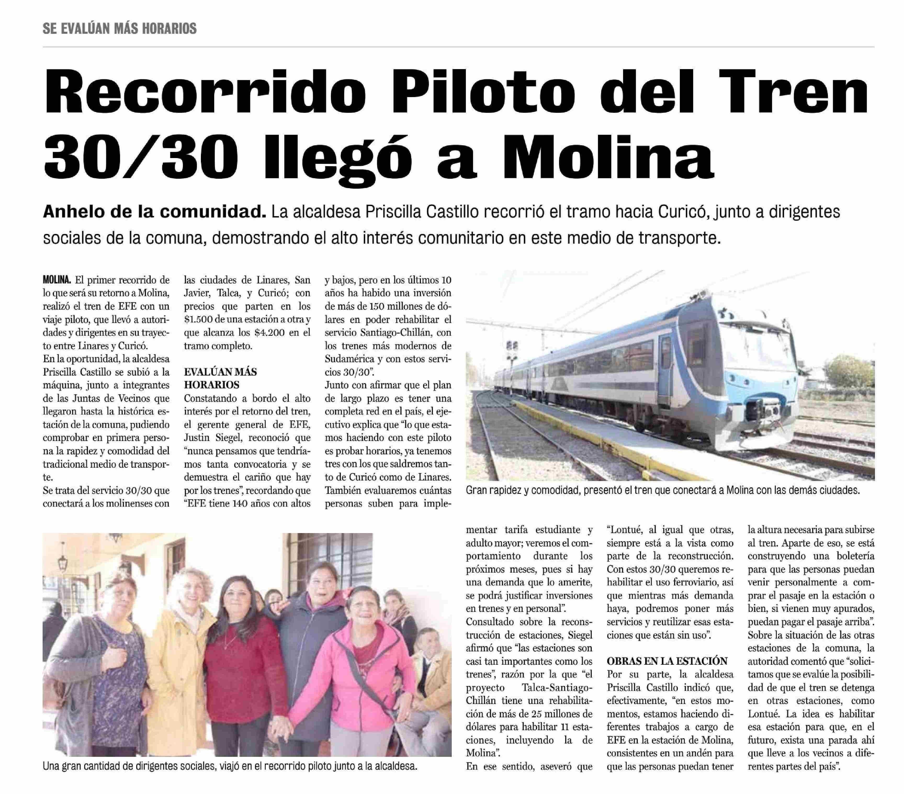 Recorrido Piloto del Tren 30/30 llegó a Molina 18-05-2024 La Prensa de Curicó |