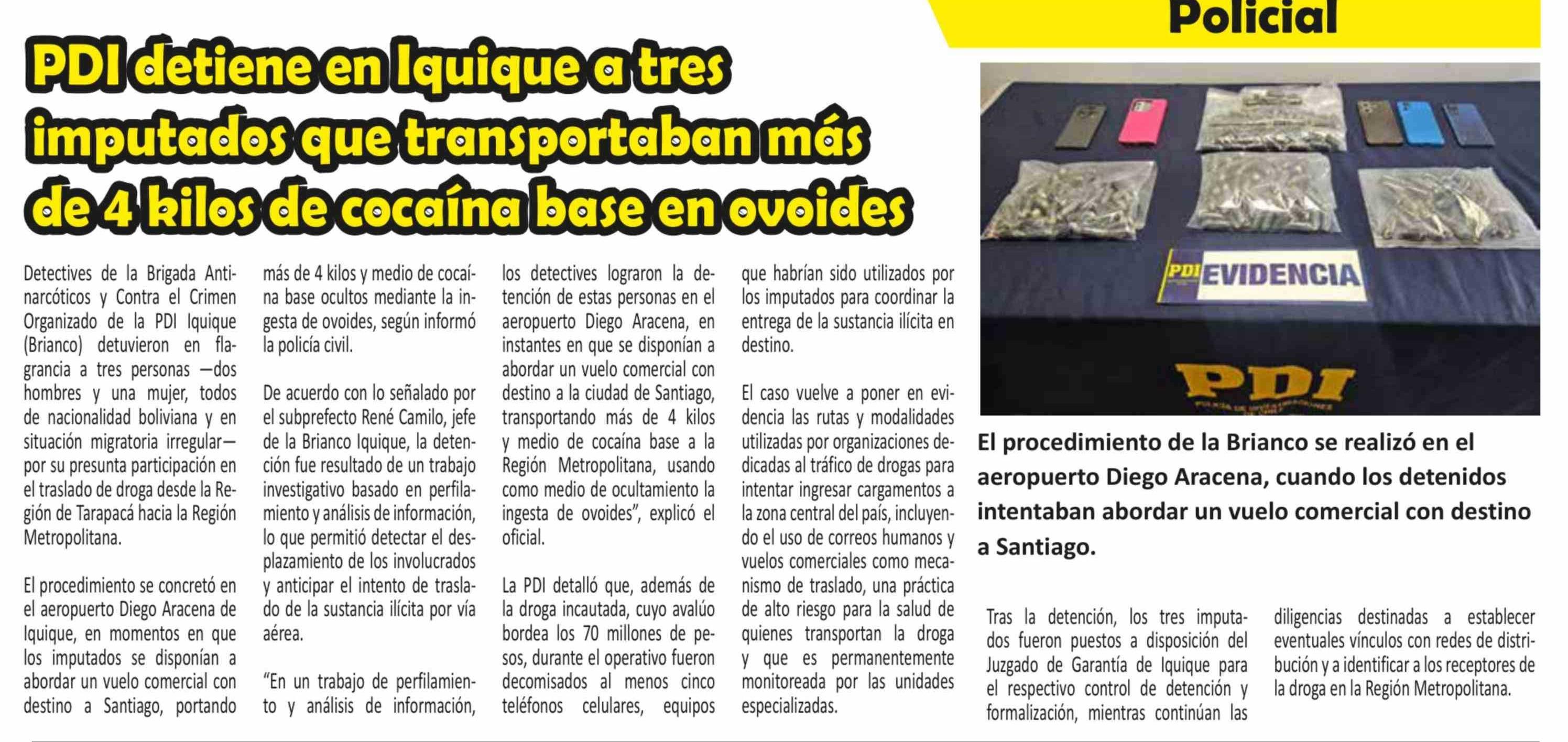 Título: PDI detiene en Iquique a tres imputados que transportaban más de 4 kilos de cocaína base en ovoides