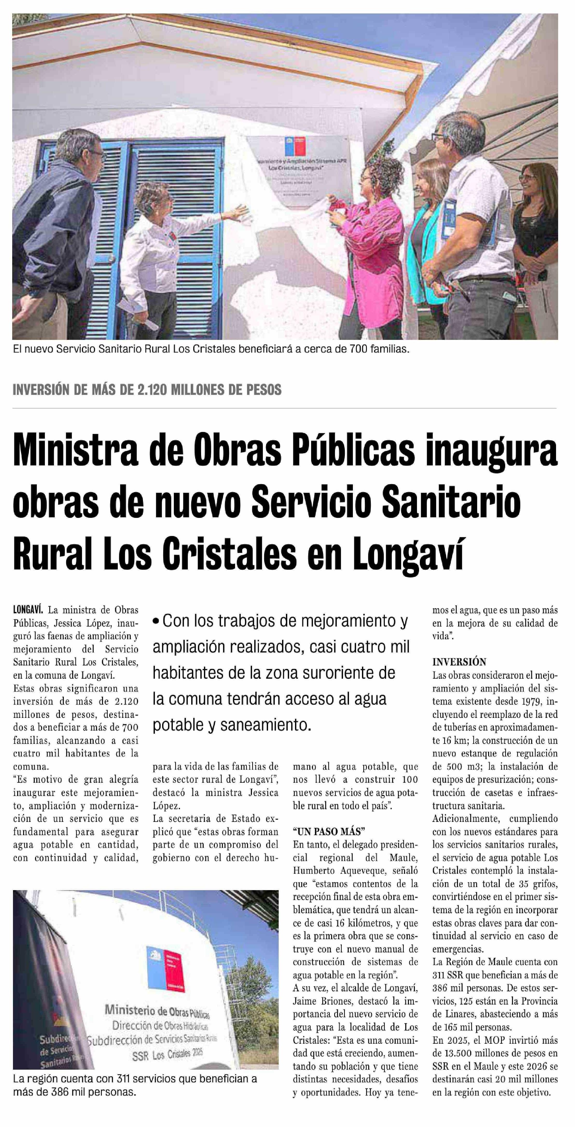 Título: Ministra de Obras Públicas inaugura obras de nuevo Servicio Sanitario Rural Los Cristales en Longaví