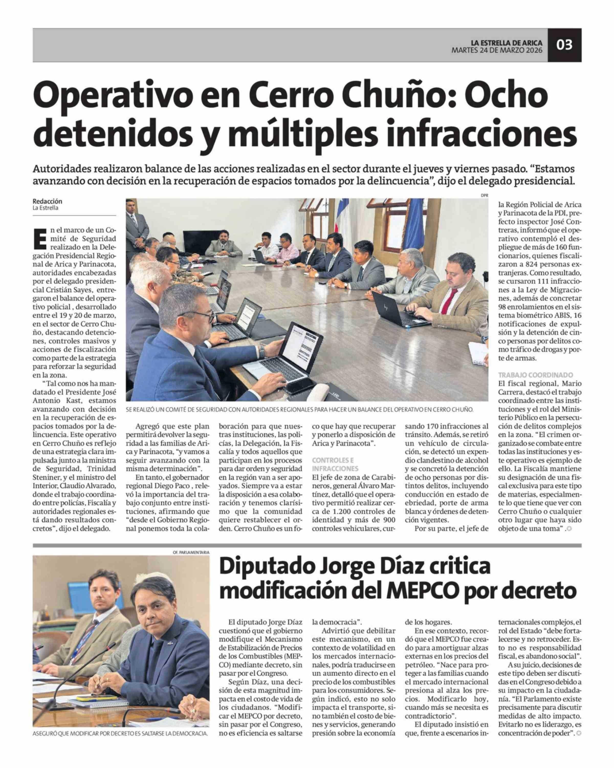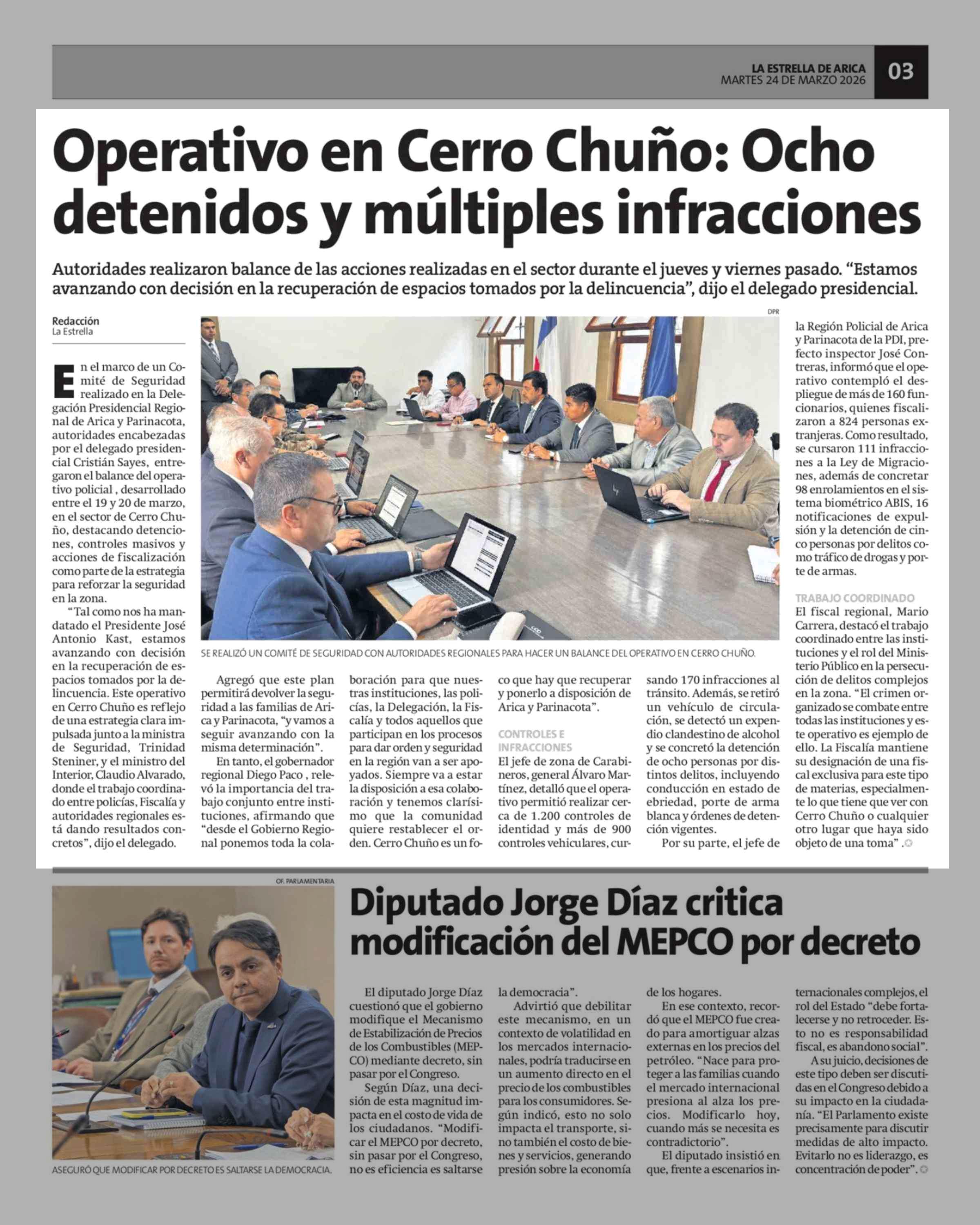 Operativo en Cerro Chuño: Ocho detenidos y múltiples infracciones 24-03-2026 La Estrella de Arica |