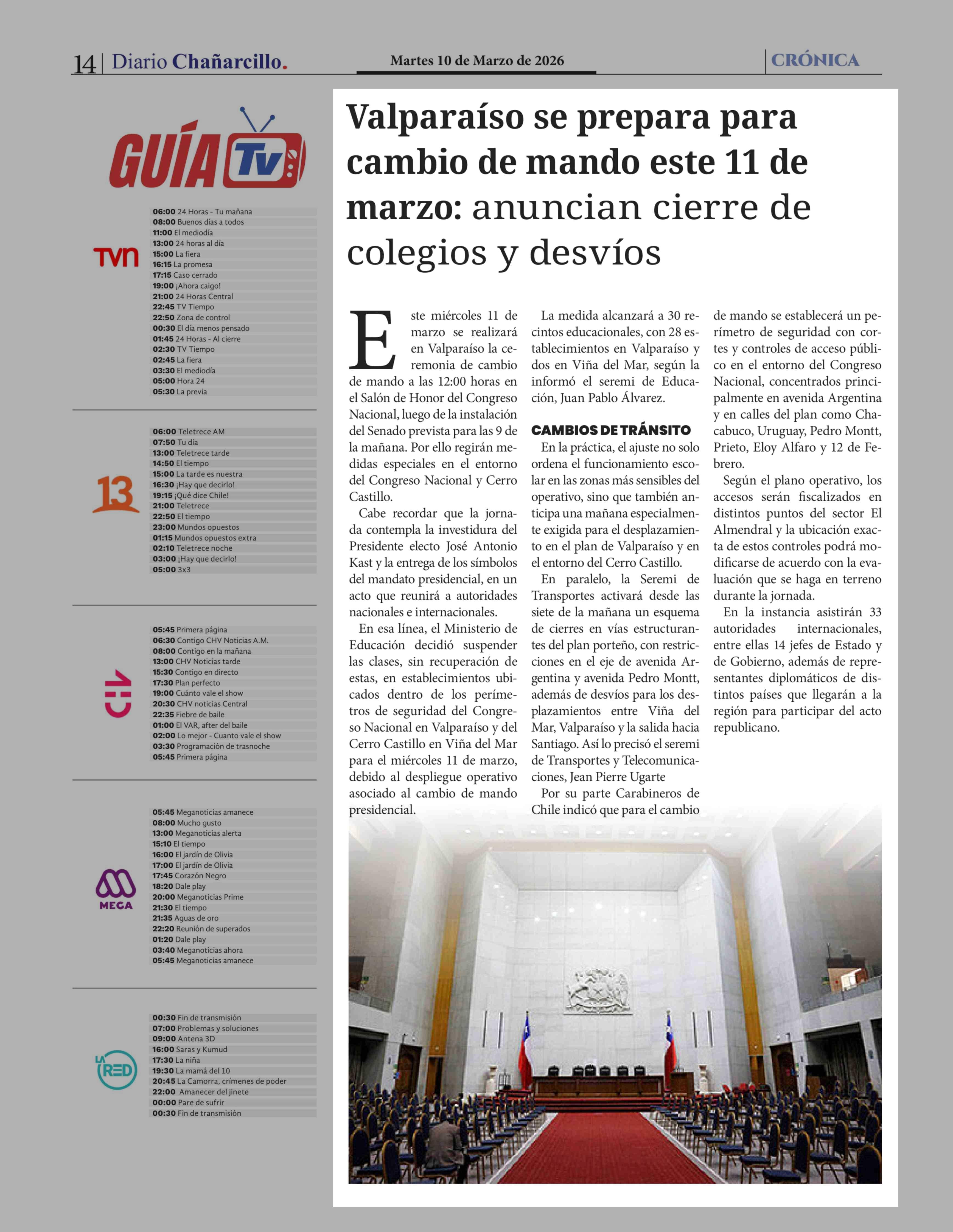 Valparaíso se prepara para cambio de mando este 11 de marzo: anuncian cierre de colegios y desvíos 10-03-2026 Diario Chañarcillo |