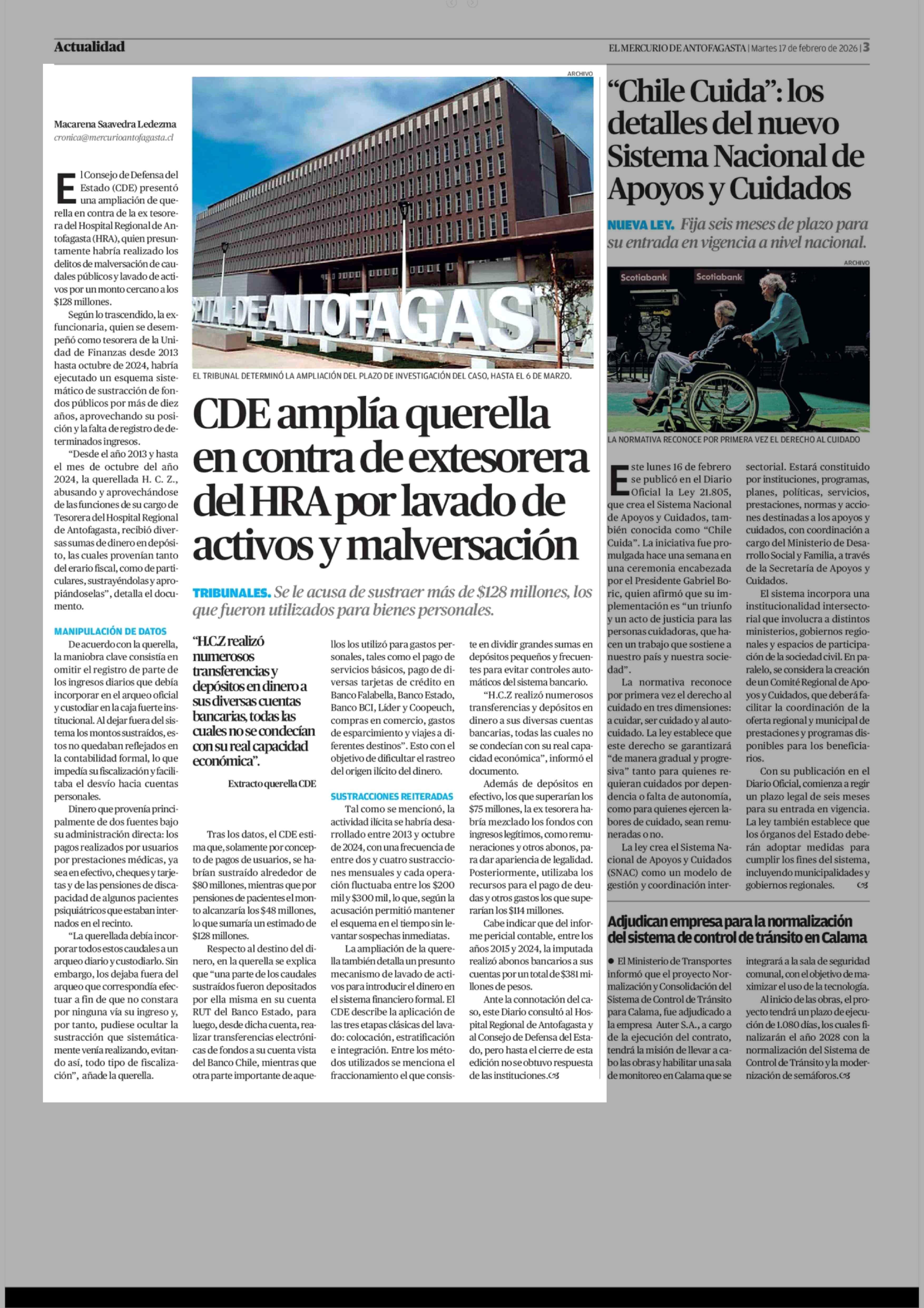 CDE amplía querella en contra de extesorera del HRA por lavado de activos y malversación 17-02-2026 El Mercurio de Antofagasta |