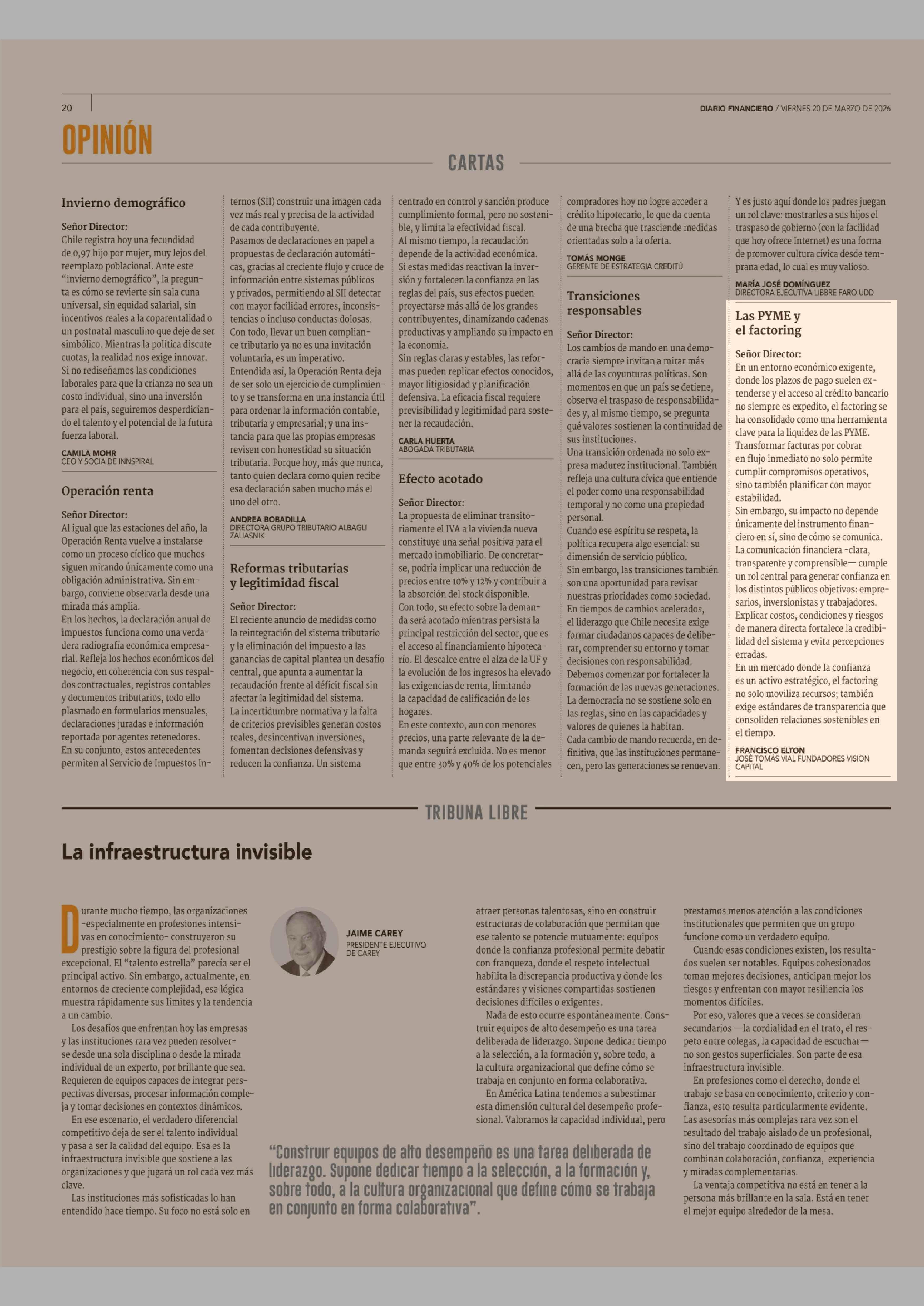Cartas: Las PYME y el factoring 20-03-2026 Diario Financiero |