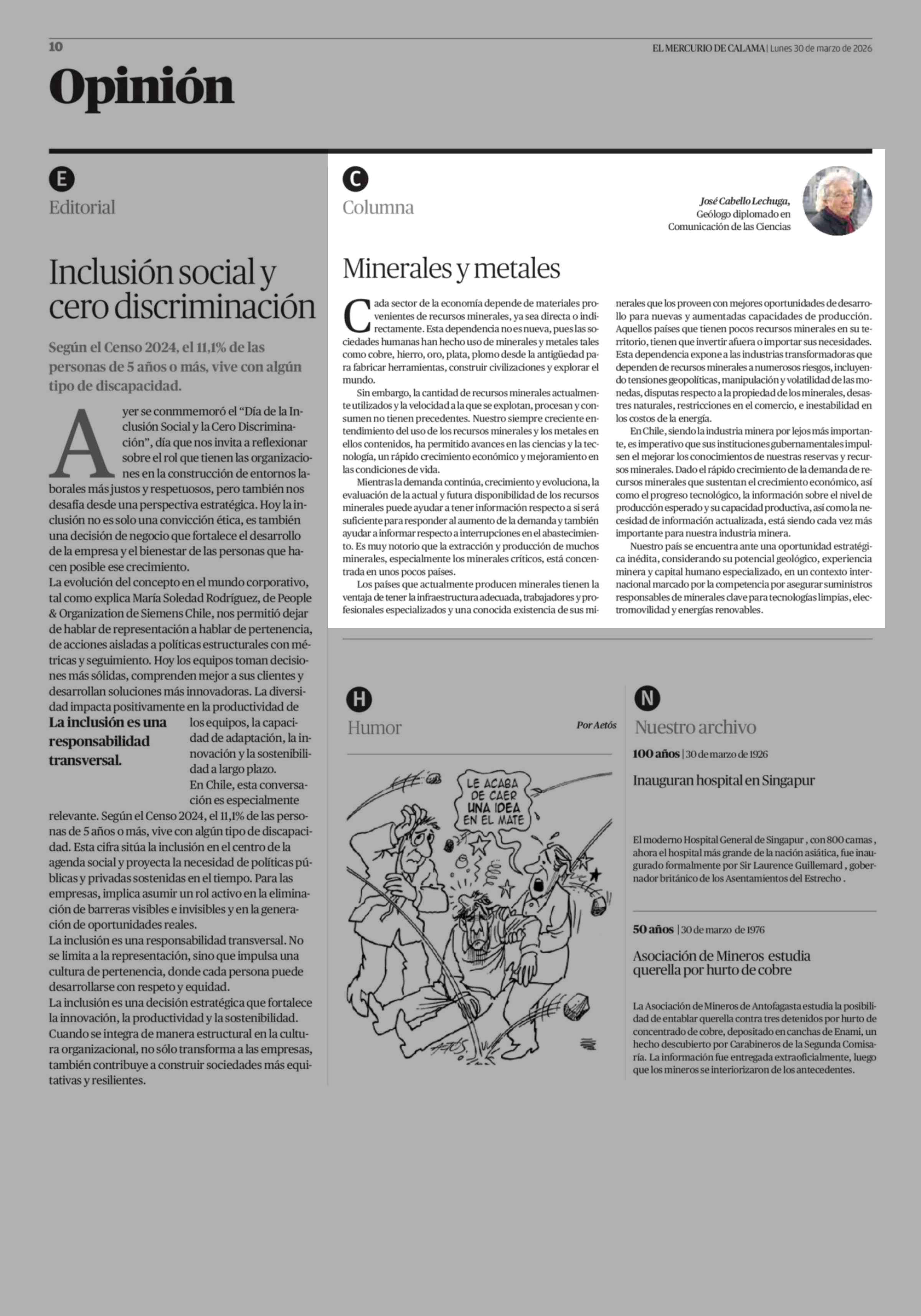 Columnas de Opinión: Minerales y metales 30-03-2026 El Mercurio de Calama |