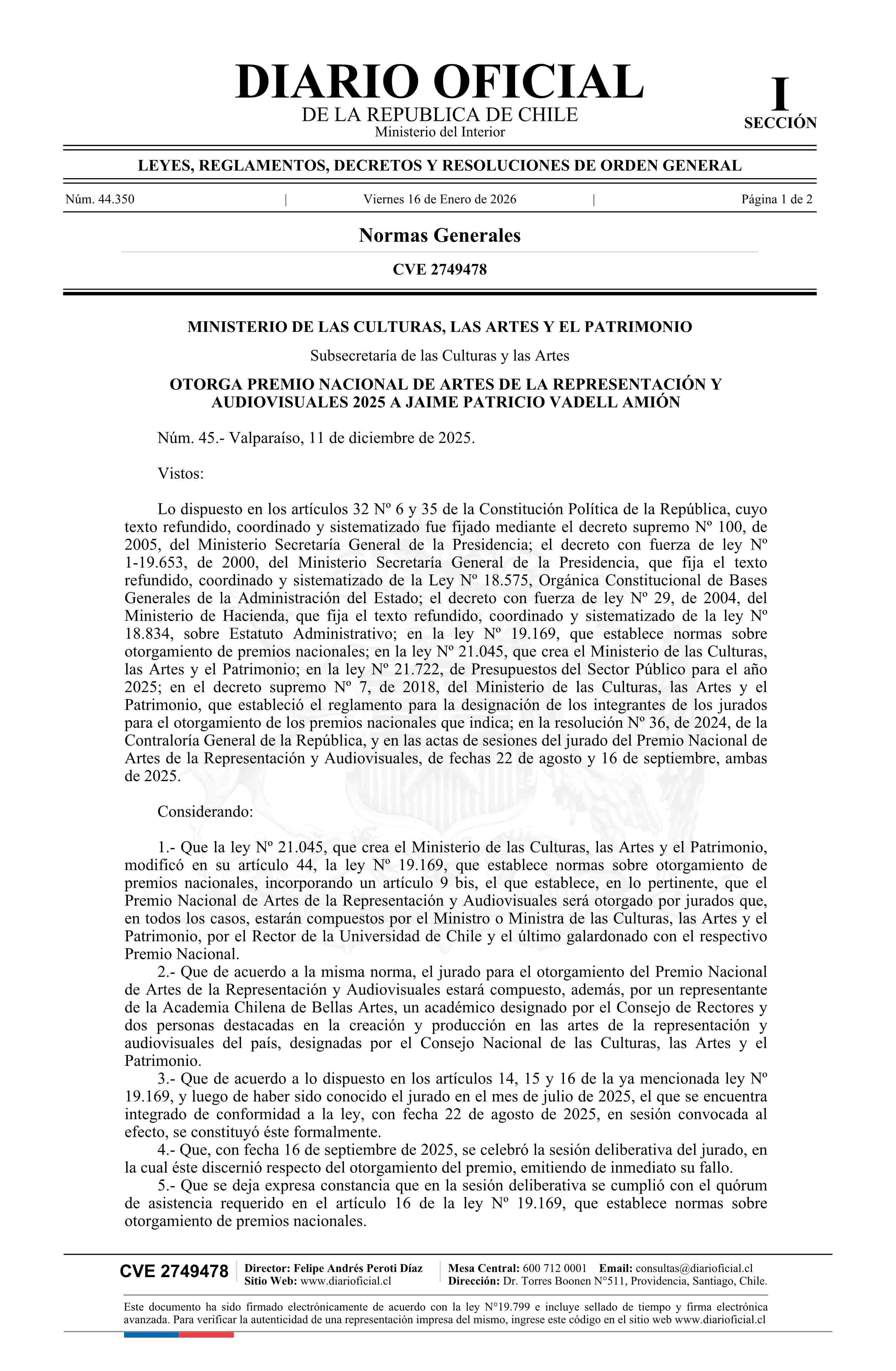 Decreto número 45, de 2025.- Otorga Premio Nacional de Artes de la Representación y Audiovisuales 2025 a don Jaime Patricio Vadell Amión 16-01-2026 Diario Oficial Edición Electrónica |